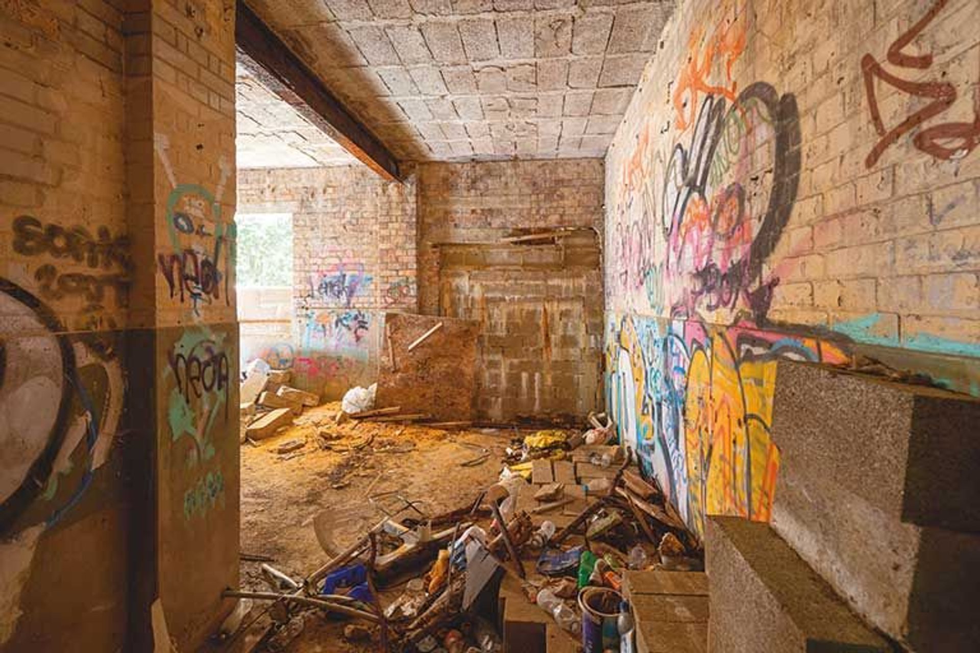 The abandoned concrete building had been spectacularly vandalised and covered in graffiti.