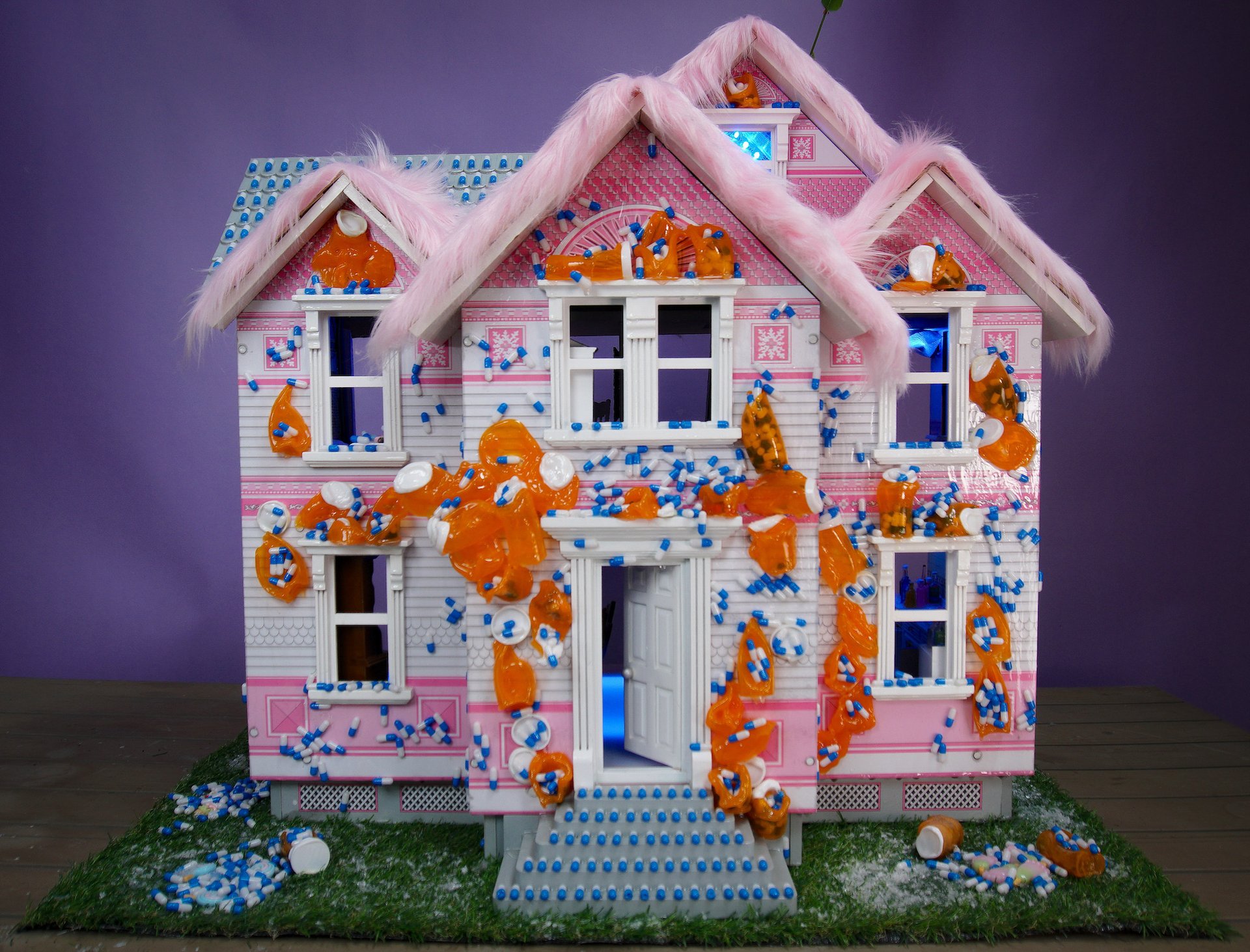 Alongside the centrepiece of the show, a fall-filing projection of the short film documenting the Putin’s Ashes performance, there are posters featuring lyrics from Pussy Riot’s first song, Kill the Sexist, and text from Tolokonnikova’s court sentence. Atop the texts are drawings of a vagina-shaped Virgin Mary figure, which the artist says resulted in her being added to Russia’s list of wanted criminals. In the centre of the room is a sculpture featuring a dollhouse, HAUNTED! (2023), whose façade and interiors are covered in pills and orange pill bottles crawling over every surface like invasive species. The pill bottles are for duloxetine, Tolokonnikova says, “the medication I have to take ever since I got out of jail because I was diagnosed with PTSD and depression. I hate these pills and am trying to get off them. But they keep coming back to my life. And it’s always a struggle.” The work is accompanied by a soundscape and poetry created by Bono of U2. One passage states, “I turned my rage into beauty and my beauty into rage.”