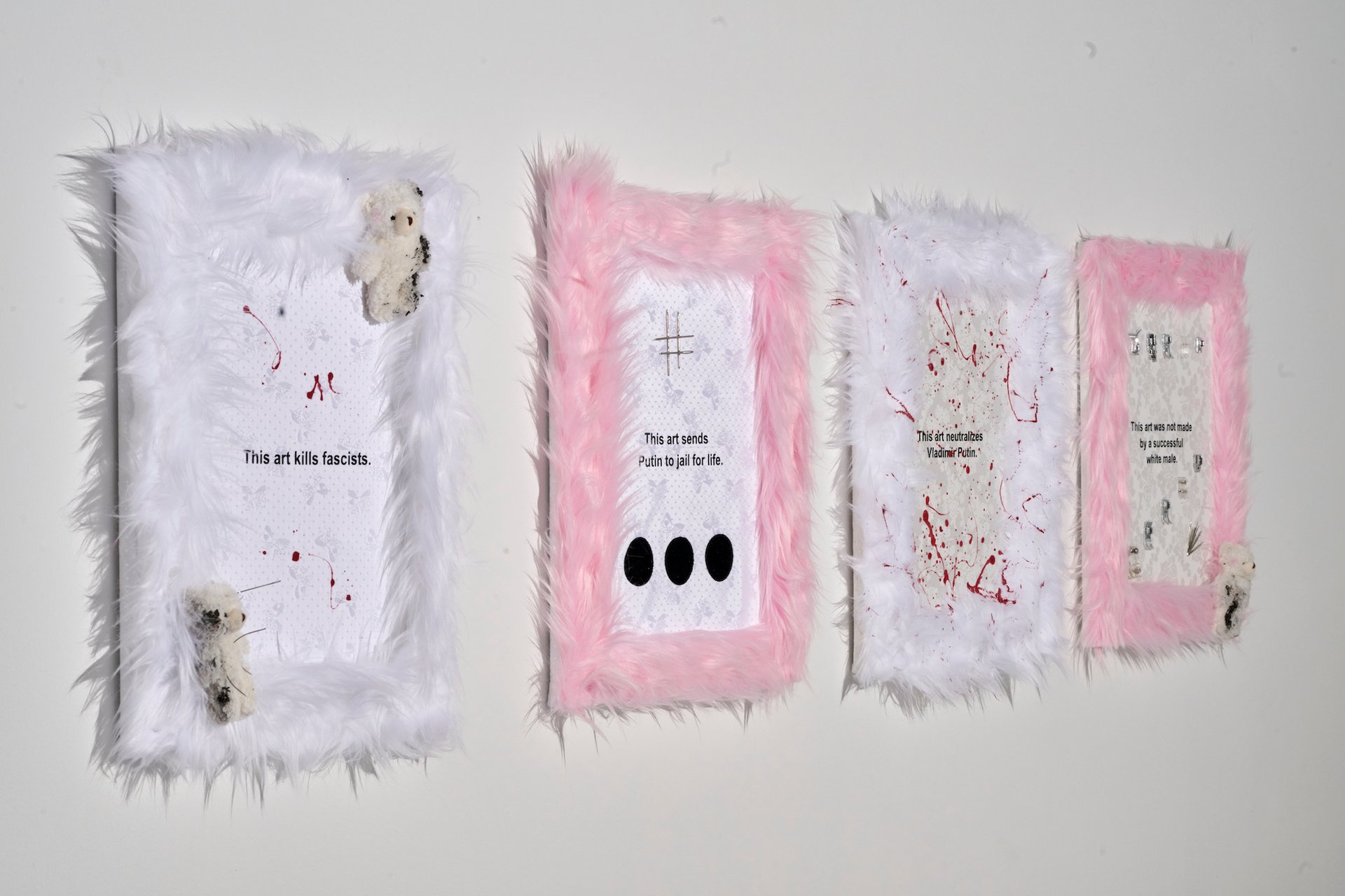 The space is part white cube, part street protest, with paint-splattered barrels placed throughout and graffiti on the walls. Near the entrance are plush-framed panels featuring phrases such as “this art is too political” or “this art is created by a criminal”. Some of them are splashed with red paint to evoke blood, some have sewing machine parts attached to them.