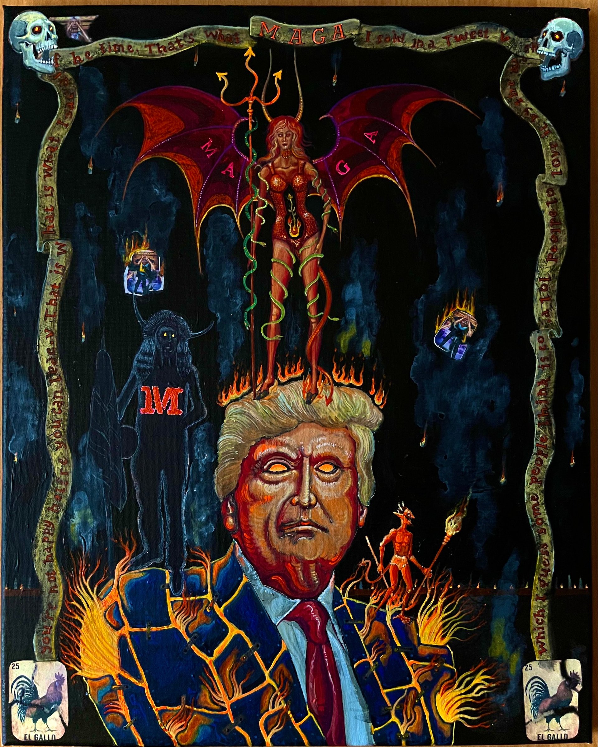 Had they done so, they might have seen among the recent pieces displayed there a painting of former US president Donald Trump as a satanic monster (Trump MAGA Demons), one of a fire-breathing Florida governor Ron DeSantis (De Santis Woke Racist) and a painting of a flaming demon representing the US Immigration and Naturalization Services (INS Beast). A 2020 series of paintings, Trumpesito Set, all took aim at the former president.