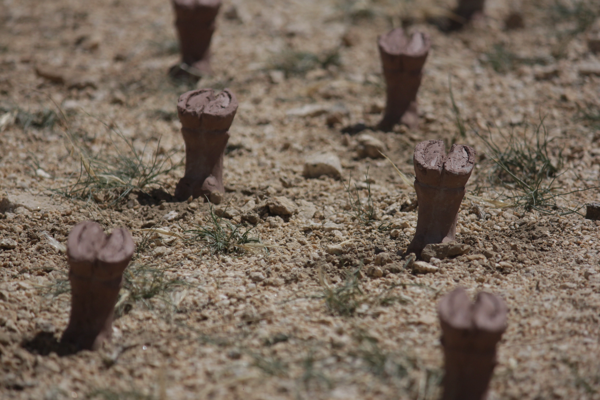 Such knowledge, held by traditional communities in Ladakh for generations, is referenced in Tundup Churpon's installation of small clay sculptures dotted on a hillside, resembling upturned sheep hooves. The ceramicist says that sheep and goat herding, and other agrarian ways of life, are being lost among modern generations, to the detriment of the environment. According to Churpon, sustainable grazing methods practised in Ladakh for centuries once helped to prevent the unseasonal flash flooding that inundated the region last month.