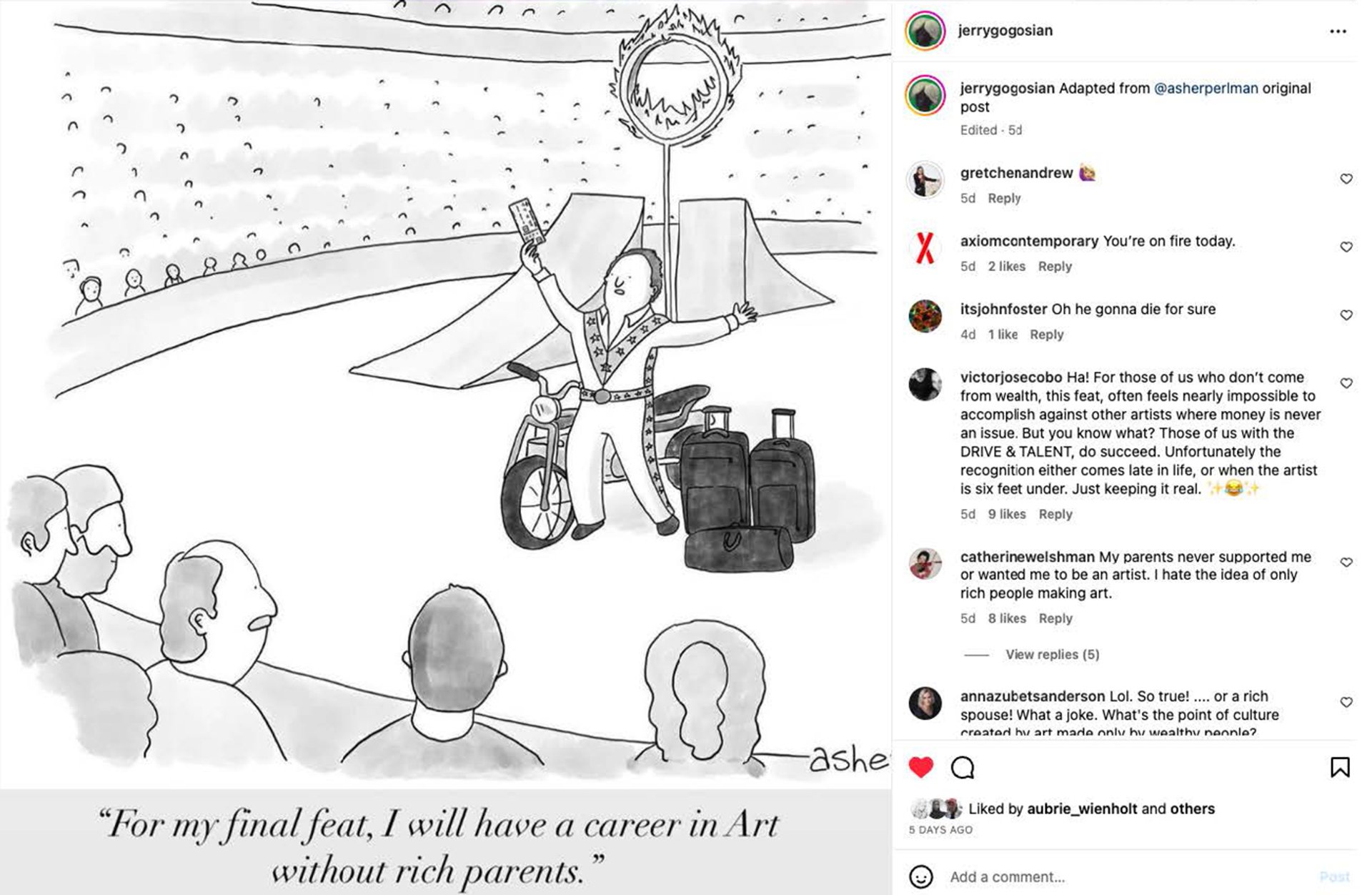 The famous @jerrygogosian Instagram account adapted(above) an Asher Perlman cartoon from The New Yorker (below) to make a point about funding in the artworld