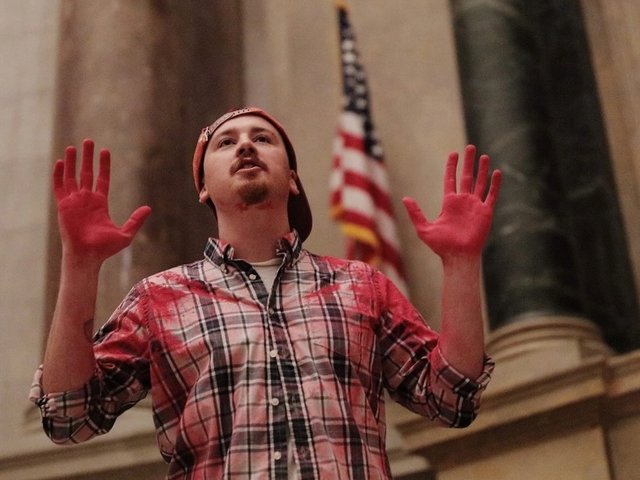 One man, Kaleb Suedfeld, was arrested by Ottawa police and is being charged with criminal mischief, according to the Globe & Mail. In a statement taking responsibility for the protest, On2Ottawa said the paint used was washable, and called on Canada’s government to take “urgent action on the climate and ecological crisis”. In a video of the incident posted on the group’s Facebook page, a protestor is seen smearing paint on the painting, glueing one of his hands to the gallery floor and then using the other to take printed remarks from his pocket, which he then reads.