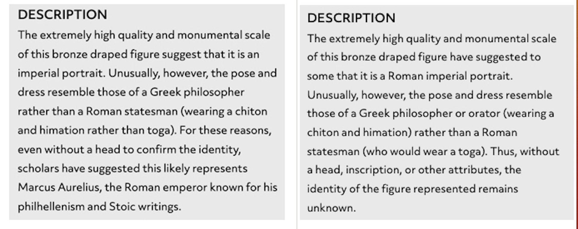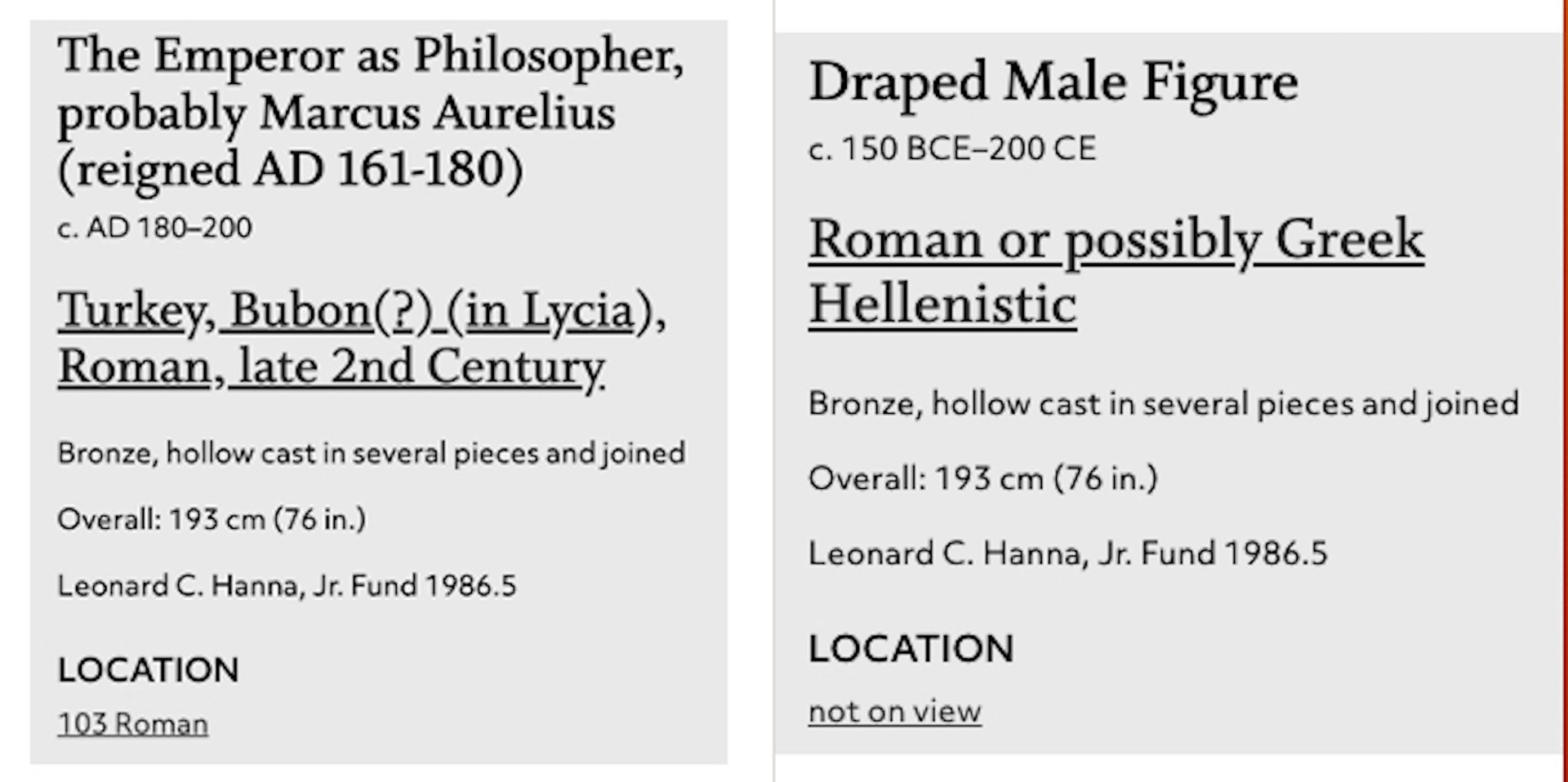The most recent developments, however, negate that context. Not only did the museum remove the statue from view and the Manhattan District Attorney issue a warrant for its seizure; the statue’s online listing has been rewritten. The references to Bubon, to Turkey and even to Marcus Aurelius have been deleted. It is now simply called a “Draped Male Figure”. There is no information about where it came from. Its hypothesised date is no longer the period after Marcus’s death. Instead, the museum throws up its hands, claiming it could have been made at any point over a 350-year span, between “150 BCE and 200 CE”. It could be “Roman or possibly Greek Hellenistic”. Although the museum has not removed an embedded video titled “Imperial Portrait?” that discusses Marcus Aurelius, this more specific information is directly contradicted by the new written description of the statue, which states that, “Without a head, inscription or other attributes, the identity of the figure represented remains unknown.” In fact, an inscription to Marcus Aurelius at Bubon has been known since 1993.