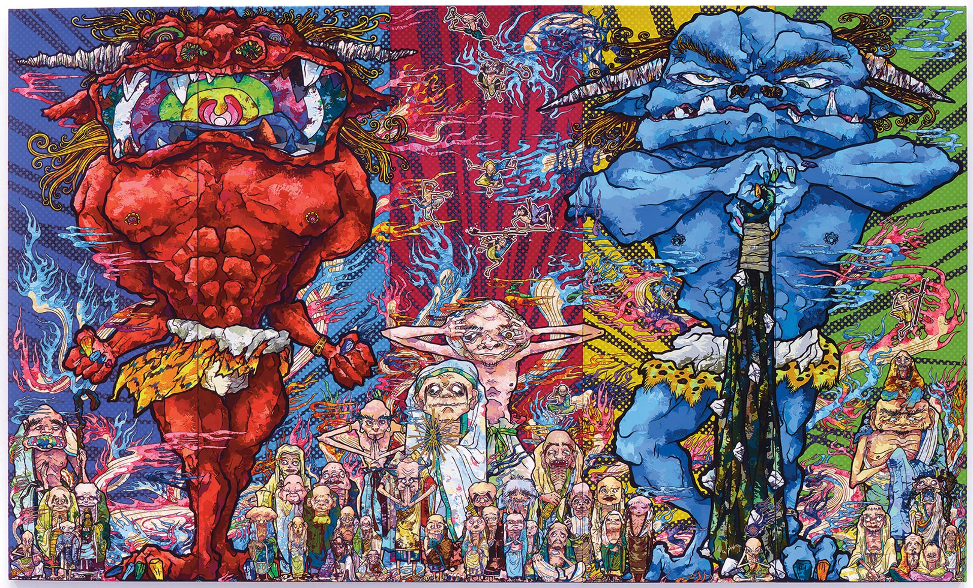 Murakami’s painting Red Demon and Blue Demon with 48 Arhats (2013) combines themes of Buddhist divinity, Edo period printmaking and contemporary Japanese kawaii culture Photo © Phillips Auctioneers; courtesy of the artist and The Heller Group