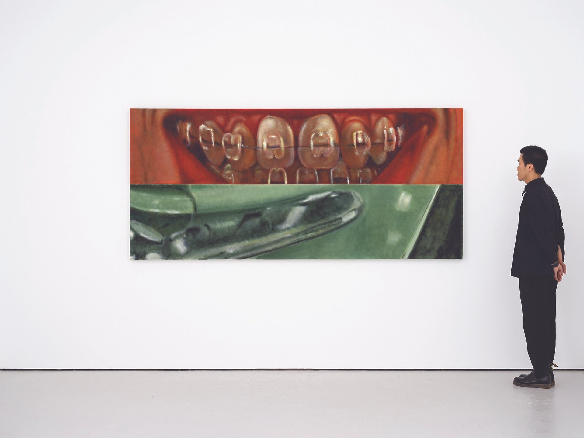 Brace yourself: one of the paintings by Issy Wood in her Seoul exhibition, Look Ma, No Cavities (2023), revealing her “penchant for the seductive banality of contemporary image culture”