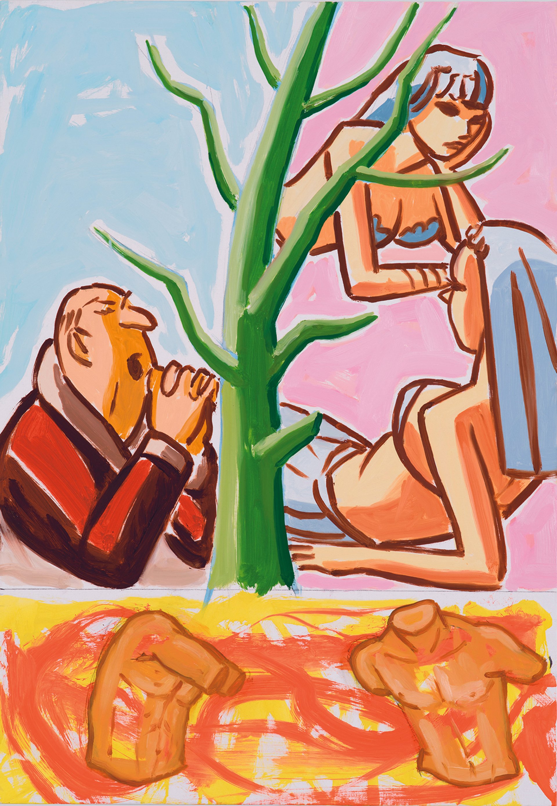 David Salle’s Prayer Works, Tree of Life (2023), one of the final works in the artist’s Tree of Life series, which he began in 2020. The graphic style recalls that of the droll cartoons of Peter Arno, the famous New Yorker cartoonist