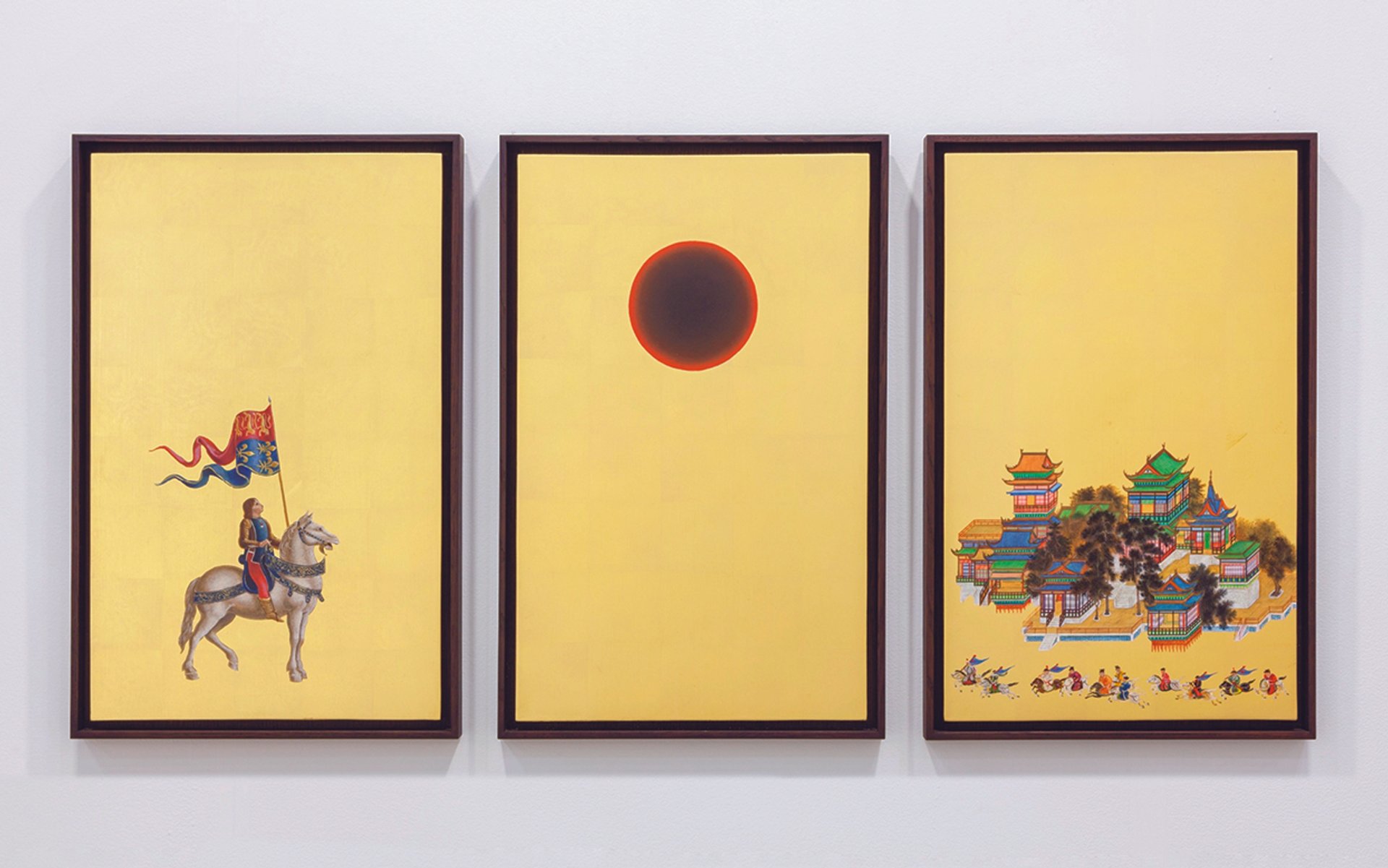 Lyu recently bought this triptych by the French artist Laurent Grasso from his series Studies into the Past, which combines traditional painting with a contemporary theme