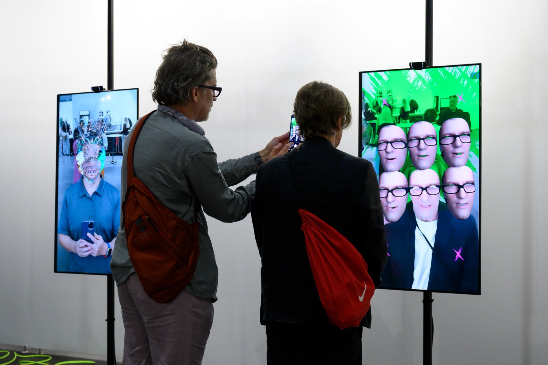 Examples of Janos's interactive Infilteriterations series are on view at Transfer’s stand at the venue’s rear. Visitors who face the digital cameras mounted atop a trio of human-size LED screens see their actual faces adorned by colourful, multilayered digital filters equally indebted to Saturday-morning cartoons and the masks of ancient warriors or sci-fi fighters. The experience was a hit, as delighted visitors continuously mobbed Transfer’s stand until the end of preview day.