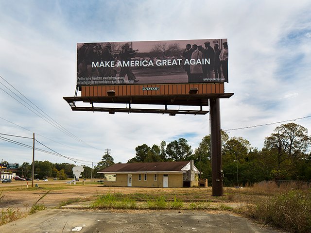 In Atlanta, for example, a digital billboard by Eric Gottesman displays the words “NEVER AGAIN” and “NEVER FORGET” against the backdrop of an American flag, highlighting relationships between nationalism, persecution and collective trauma. In Los Angeles, another by Carrie Mae Weems reads: “Let me say this, I stand with you against all forms of aggression, evil, tyranny, or violence. An attack against you is an attack against me!” In Columbus, Ohio, Deborah Kass takes a similarly direct route, with her billboard reading “Tikkun Olam” and that Hebrew phrase’s English translation, “Heal the World.”