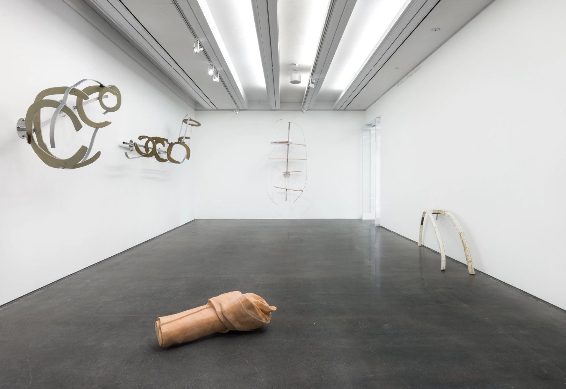 Unlike Boyer’s conception of need, Baghramian’s art does not announce itself—each piece sits, hangs, leans or lounges with the frankness of an archeological ruin. The work on display shares a visual etymology with sculptors of the 1960s and 70s whose work is often presented through a feminist lens, like Eve Hesse or Lynda Benglis, a canon filled with material articulations of embodied affect, simultaneously quotidian and grotesque.