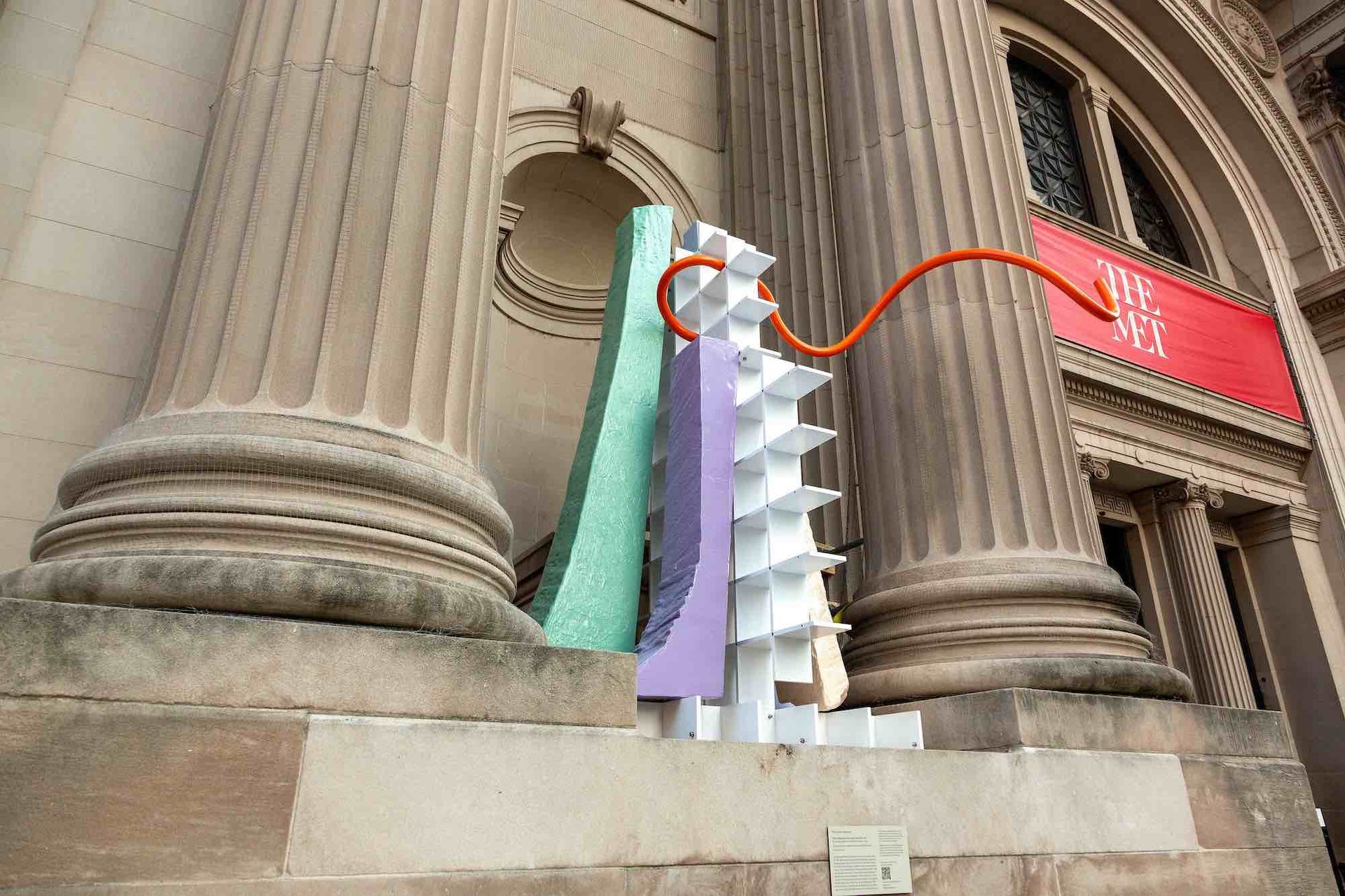 Nairy Baghramian, Scratching the Back: Drift (Tortillon orange) (2023), for The Facade Commission: Nairy Baghramian, Scratching the Back, Metropolitan Museum of Art, New York Courtesy the artist, kurimanzutto, and Marian Goodman Gallery. Image credit: The Metropolitan Museum of Art, Photo by Bruce Schwarz