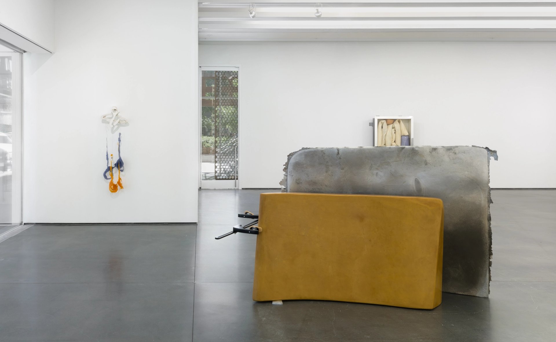 In B 75, BH, Mod. NB, Ref. CO, MM (2012)—a reference to Claes Oldenburg’s Ghost Wardrobe (for M. M.) (1967)—concrete hangers bear the negligible weight of eerily cartoonish rubber spirals, unraveling into the shape of a bright bra. The piece feels as poignant as it does goofy, a bright-colored totem to visceral absence. In the exhibition, B 75 is flanked by a cluster of large styrofoam slabs, clamped with awkward fervour against translucent shields of wax. Sturdy in presence yet elementally fragile, this material graveyard operates with a coyness that both entrances and repels the viewer, resisting any simplistic assignment of meaning while insisting on viewer interaction or, more directly, on care.