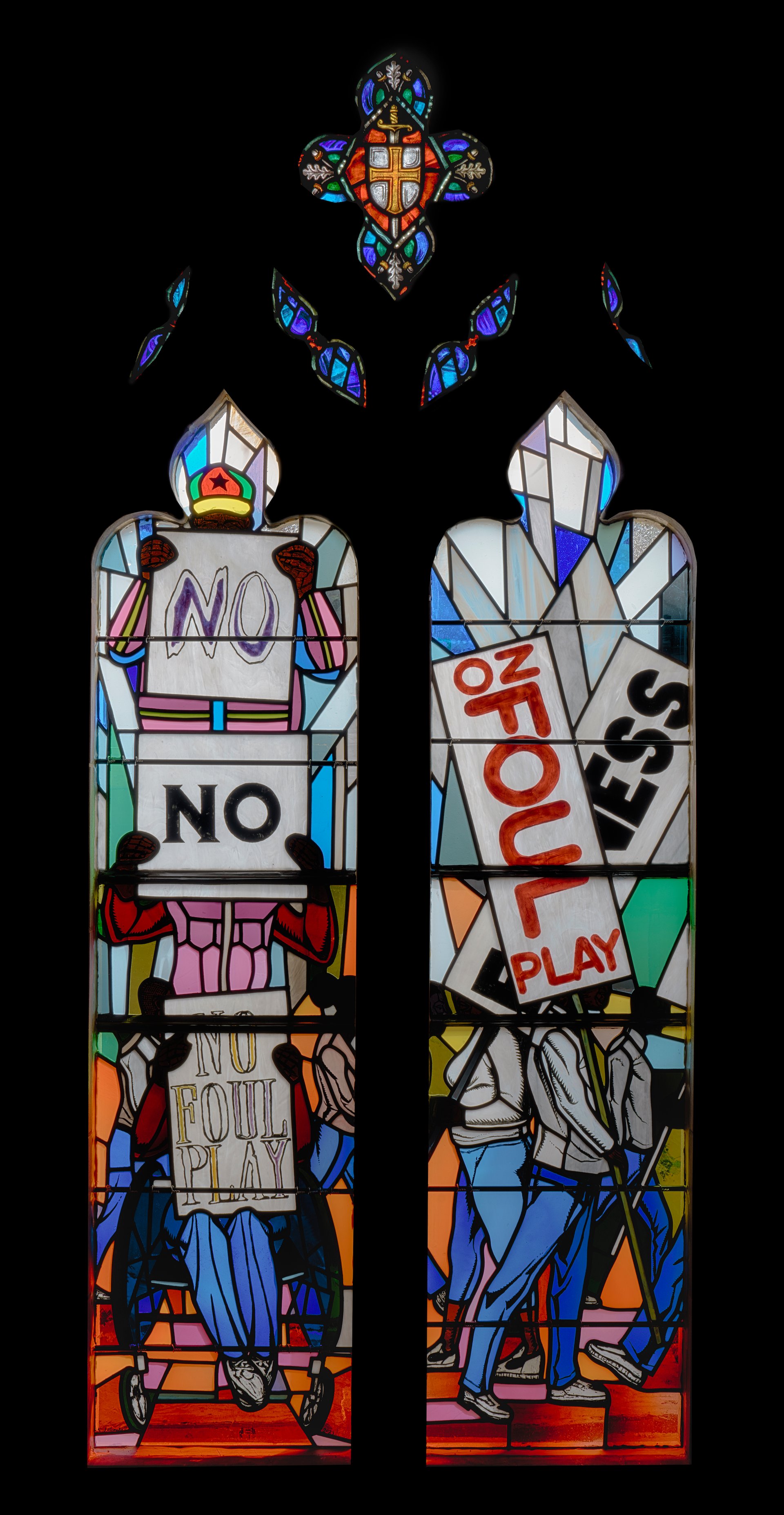 Installed in two adjacent bays, the new windows depict a crowd of Black demonstrators holding signs with messages that read “No foul play”, Fairness”, “Not” and “No”. The scene is intended to portray the ongoing march towards justice and equality, rather than a commemoration of a particular historical moment, while acknowledging the enduring efforts of Black people in the nationwide fight for civil rights.