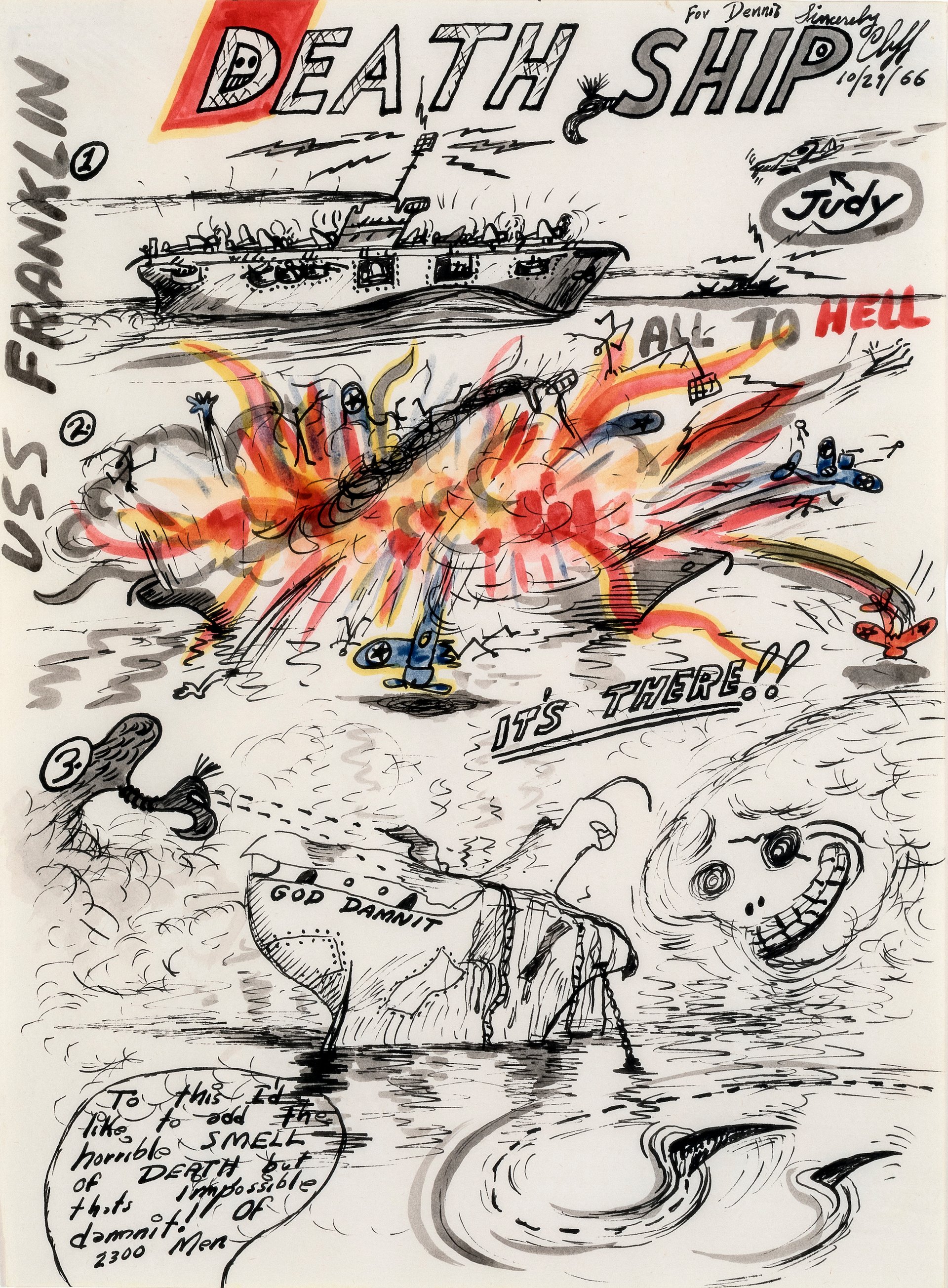 Born and raised in Los Angeles, Westermann enlisted in the US Marine Corps when he was 20, serving as an anti-aircraft gunner during the Second World War aboard the USS Enterprise, which fought in the Battle of Midway. Westermann would later make a series of “death ships” relating to the trauma he experienced during this time, specifically when the USS Franklin was downed by a kamikaze pilot, killing 2,300 people.