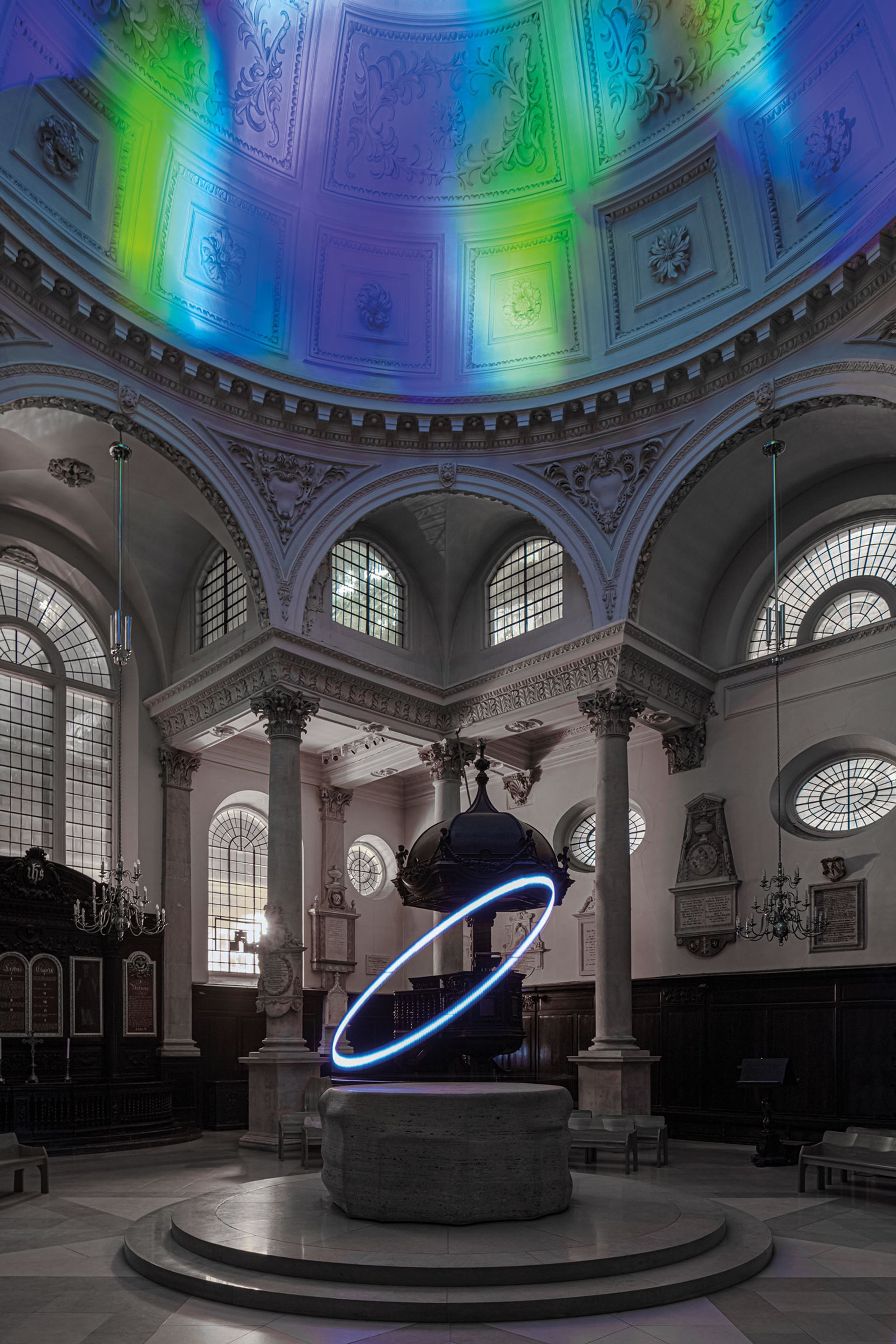 Moritz Waldemeyer's light installation Halo, at St Stephen Walbrook, London © Ed Reeve
