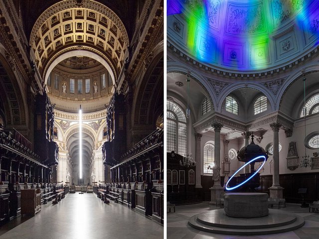London Design Festival and Bloomberg Philanthropies commissioned the church pieces from two artists, Moritz Waldemeyer and Pablo Valbuena, to mark the 300th anniversary of the death of Christopher Wren—a giant of British architecture, master of light and mathematics, and creator of London landmarks including St Paul’s Cathedral and the Royal Hospital Chelsea.