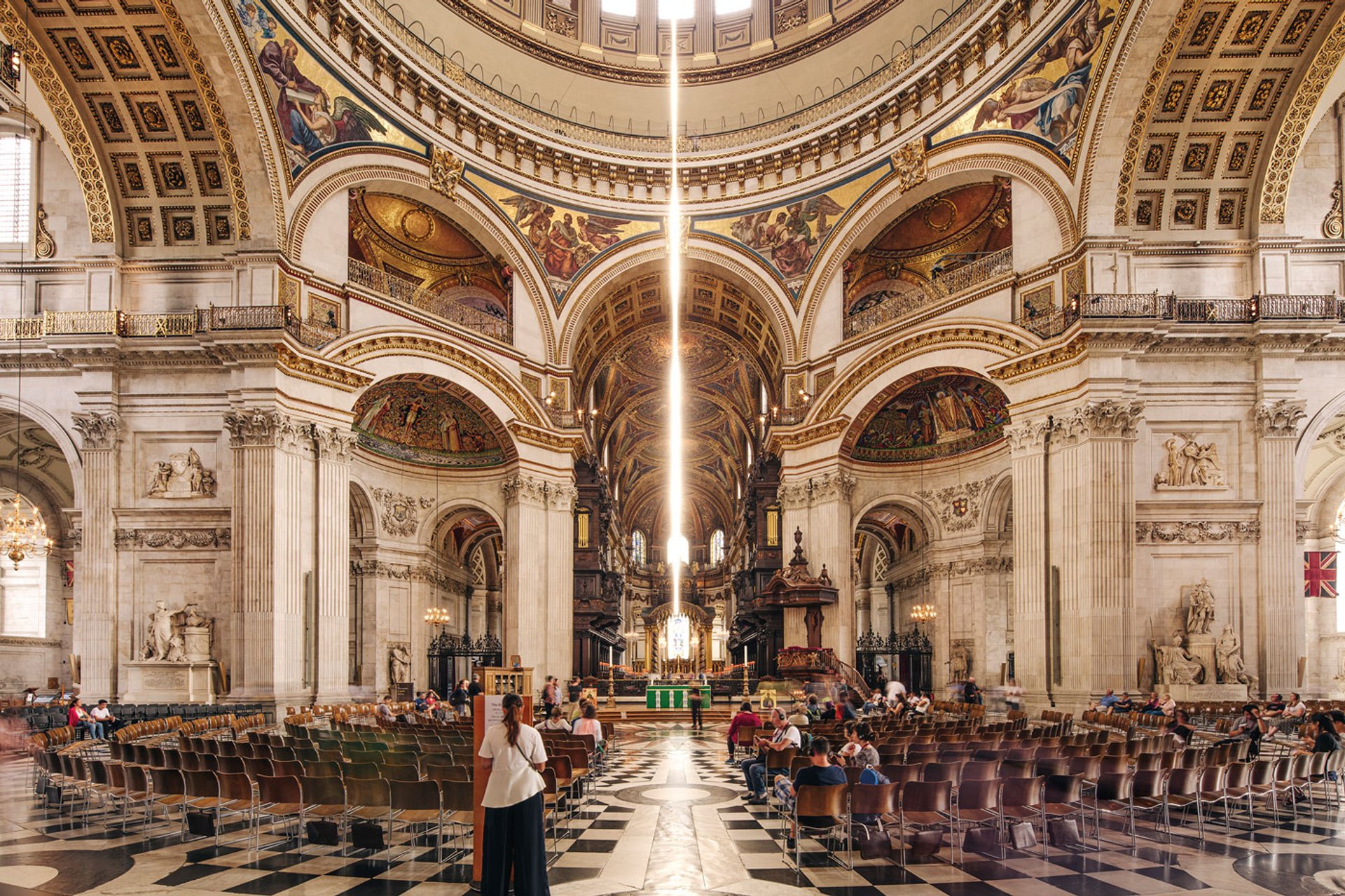 Valbuena, the France-based, Spanish installation and light artist, created Aura for St Paul’s Cathedral (completed in 1710). Aura is suspended by a cord from the oculus at the centre of the building’s inner dome. The light sources, a series of hundreds of custom-made LEDs, are hung on a pencil-thin aluminium frame, 20m tall. The light piece in Aura is activated by sound, using an algorithm devised by Valbuena’s team. The audio is captured by the cathedral’s microphones, for spoken words, while additional devices are used to capture the singing of the choir or placed in the organ pipes.