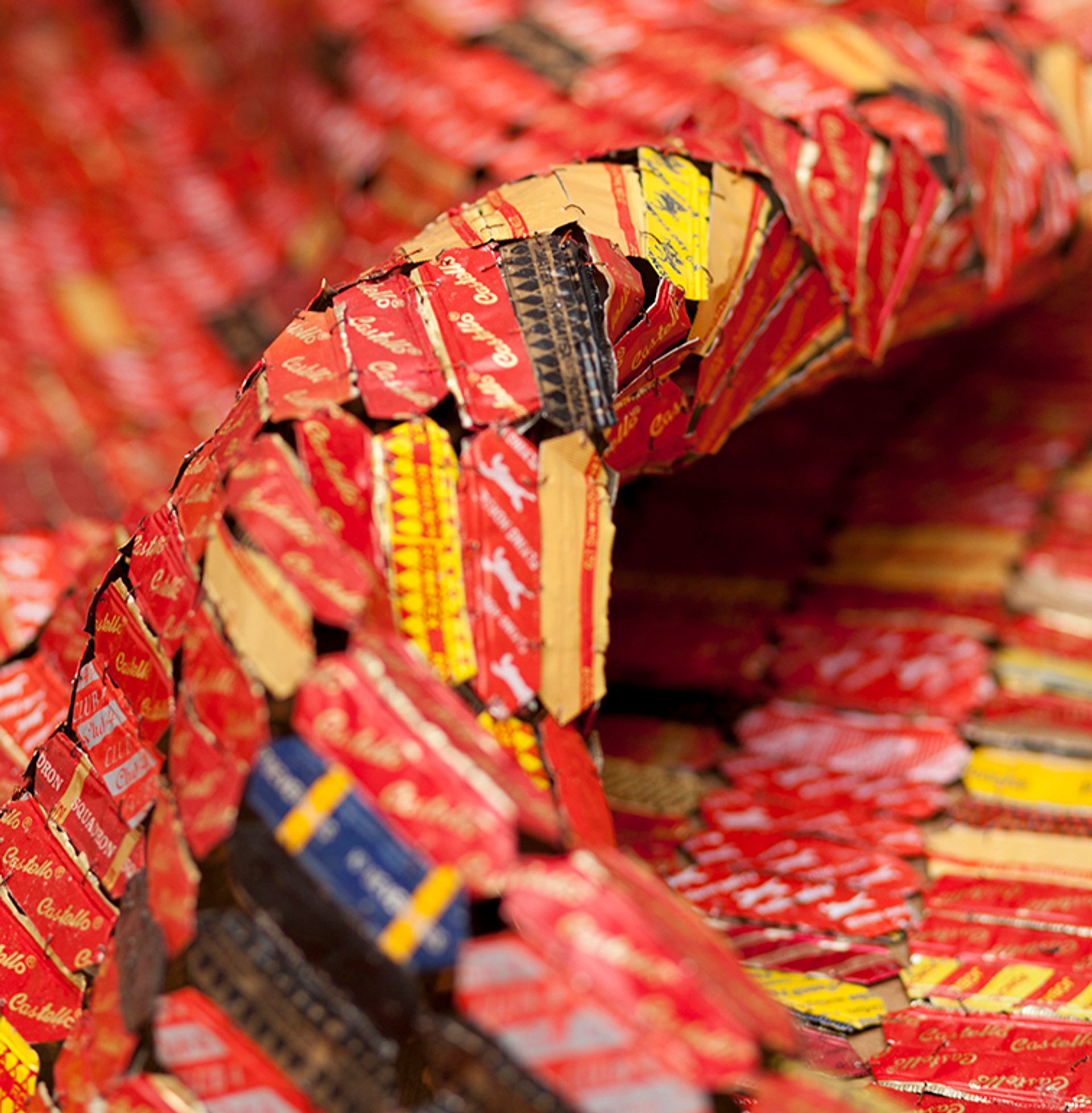 To start with I was using the inside, which is just the silver of the metal (with the colour on the outside). It was like me starting off as a sculptor not paying any attention to colour, and then all of a sudden finding something I’d been ignoring: the colours of their caps. So I had to start thinking like a painter as well, grappling with how to match colours and what to do with colour to carry some meaning or message. In the end I’m doing a combination of sculpture and painting. Because I don’t show them like a painter would show a work, stretched on canvas, I give them three-dimensional folds and forms as well. So you have form and colour all coming in.