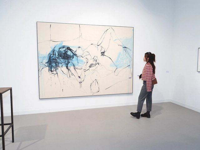 I know this one is over the limit, but for £14,000, there is a beautiful painting by Nova Jiang at Union Pacific’s stand that caught my eye. It has a post-Modernist twist. It looks like a beautiful painting of a plant in a pot, but then it has a Surrealist-style pair of scissors cutting the plant, making it slightly more sinister. I like that dichotomy.”