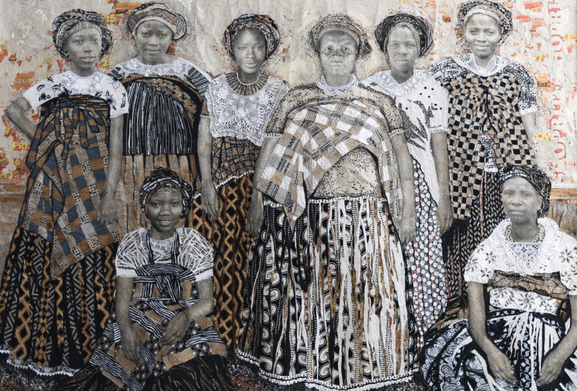 Jean David Nkot’s Untitled (Mother and Child) (2020): a large-scale portrait work with intricate cartographic details.