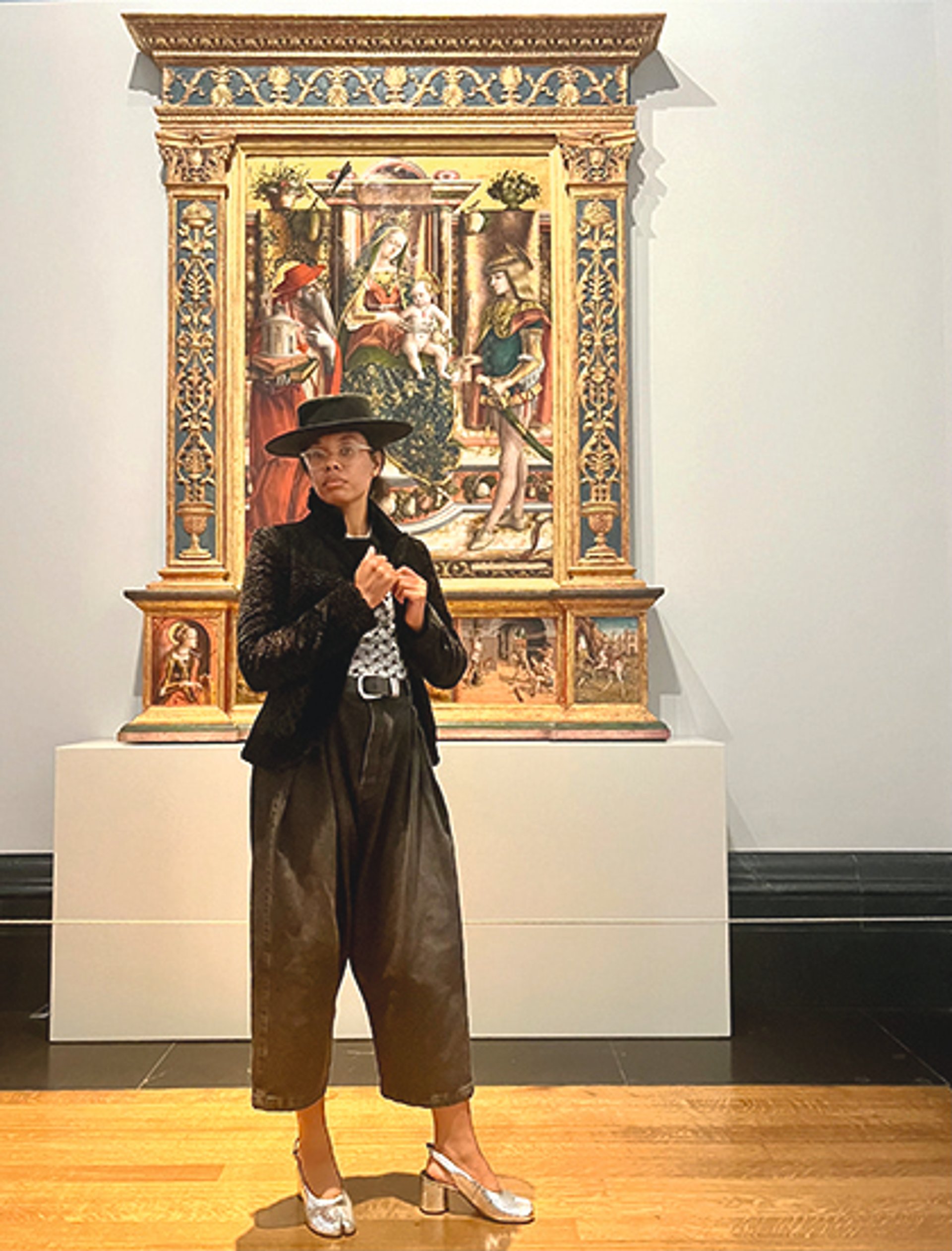 Artist Anthea Hamilton models the hat she donned in honour of Madonna delle Rondine