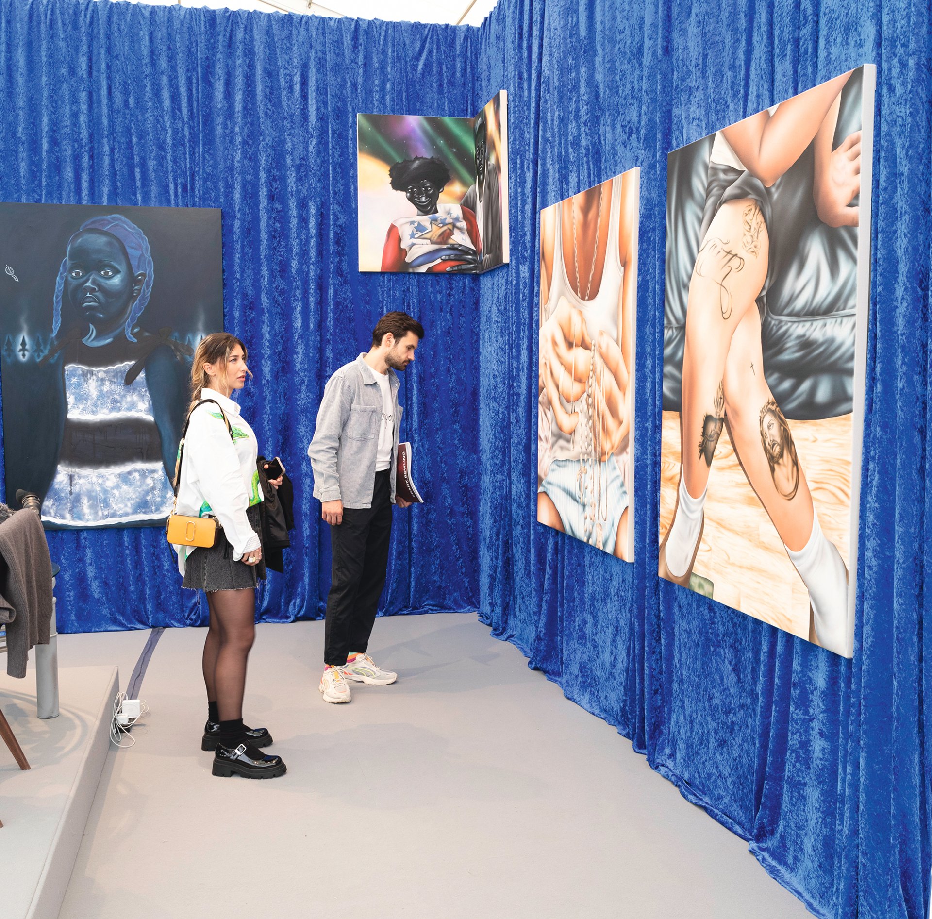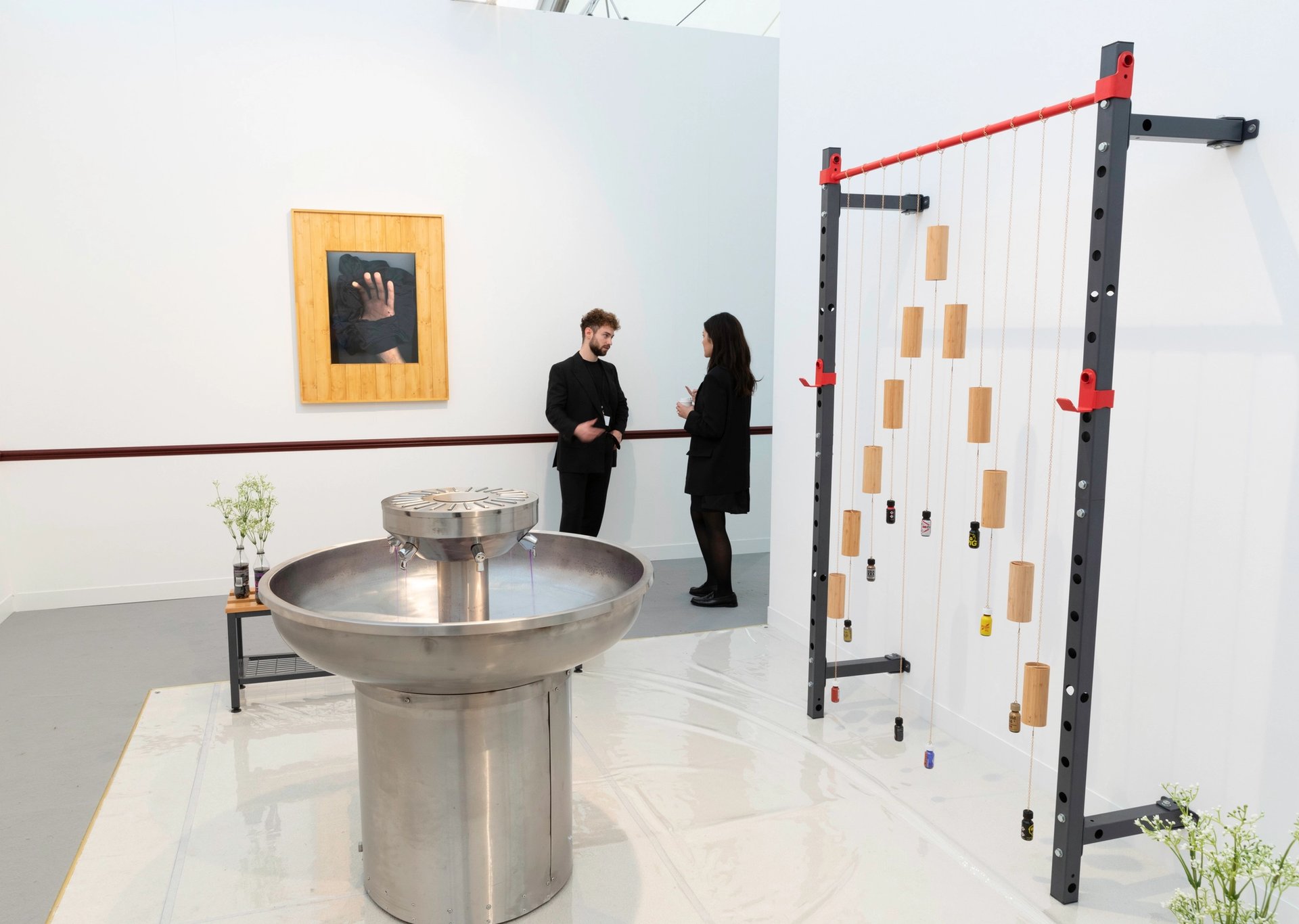 The velvet curtains and stage here are based on The Junior Christian Teaching Bible Lesson Show, a US TV programme with puppets. The host, David Liebe Hart, is giving performances at Frieze every day at 5pm. Around him are paintings by Mattia Guarnera-MacCarthy and Hamed Maiye, whose figurative imagery explores religious symbols: Guarnera-MacCarthy’s spectral images of young Black people, including a boy with a hallucinatory rosary, and Maiye’s close-ups on parts of figures with religious adornment in the form of jewellery or tattoos. The two artists have collaborated on a portrait of Liebe Hart with a puppet, Chip.