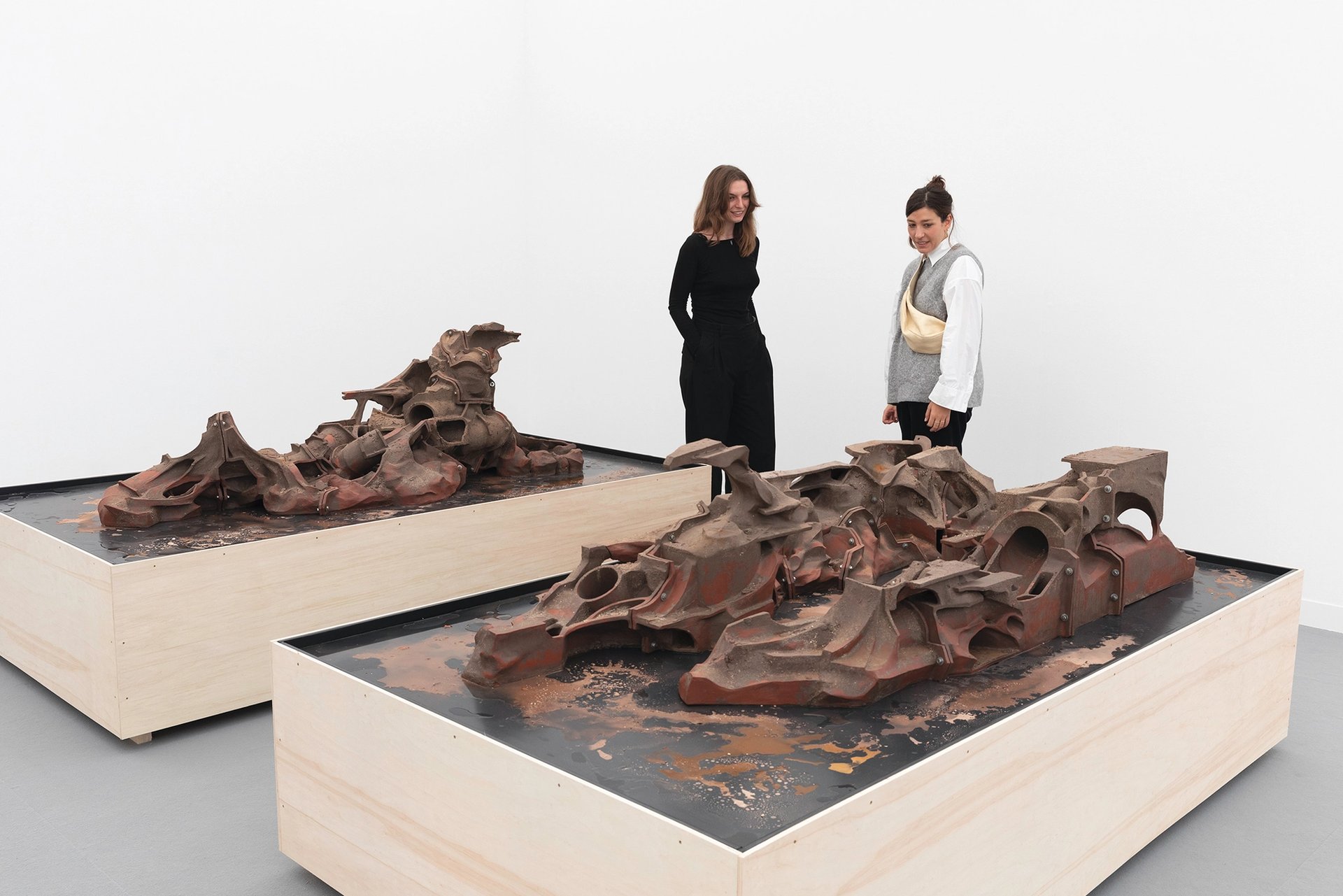 Born in Swindon, 60 miles west of London, but now based in Vienna, Sturla here presents salt-encrusted ceramic forms, redolent of fractured bodies or battered landscapes, sitting on PVC-covered plinths. At the start of the fair, the plinths contained shallow pools of salted water, which are now drying up, leaving a crystallised surface. Akin to recently dug-up archaeological specimens, they allude to an ancient source: Sappho’s fragmented poetry as translated by the Canadian classicist and poet Anne Carson. The absences in Sappho’s largely lost texts are evoked in the negative spaces of Sturla’s forms.