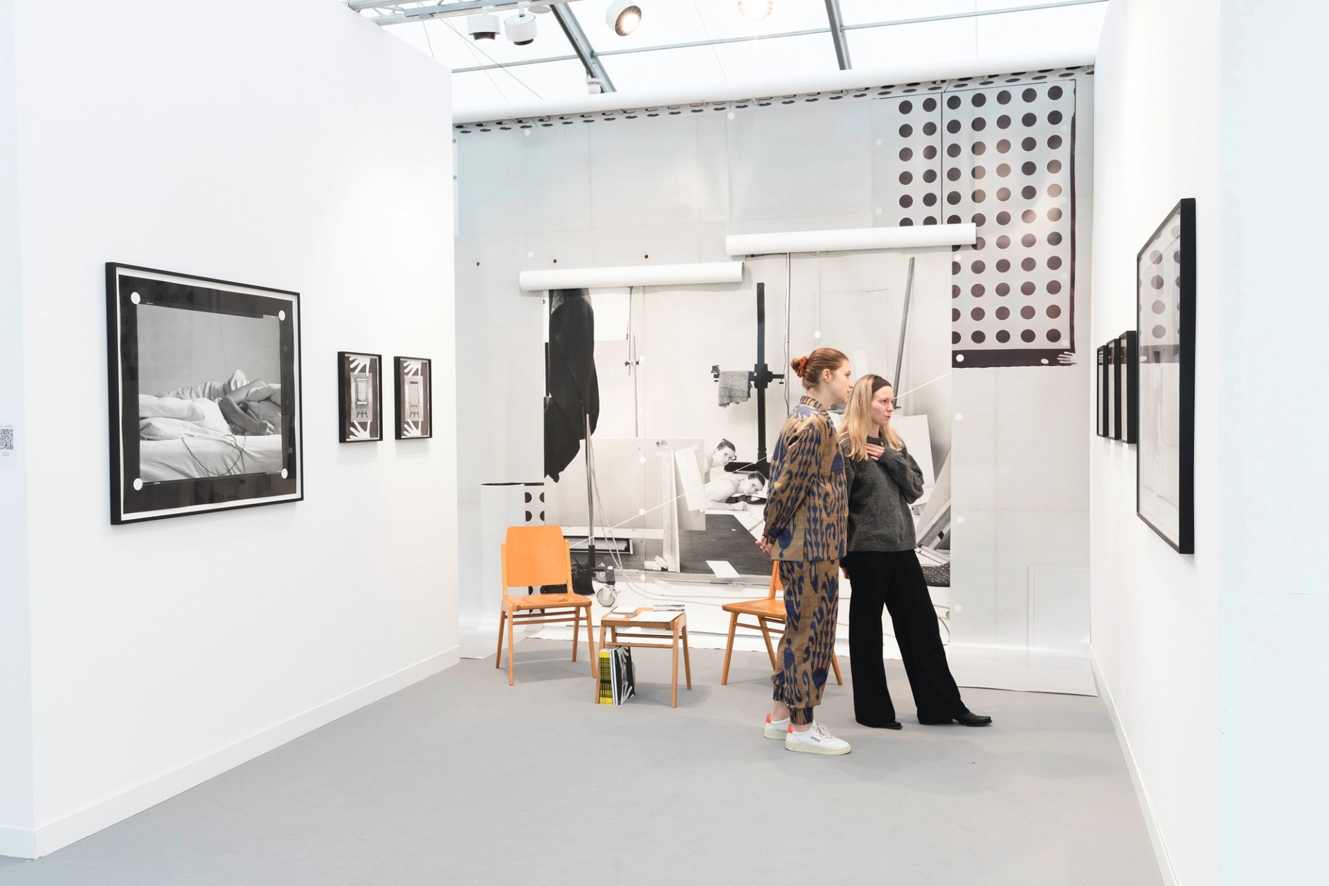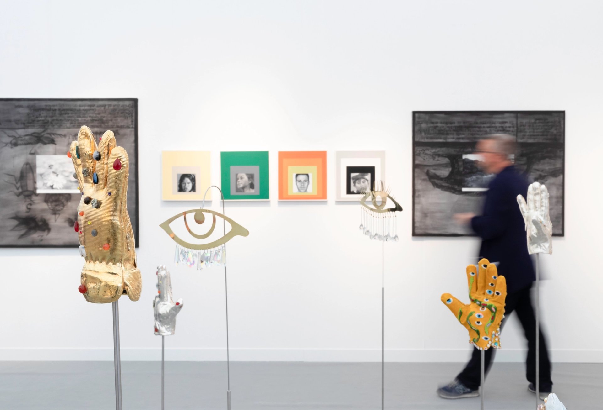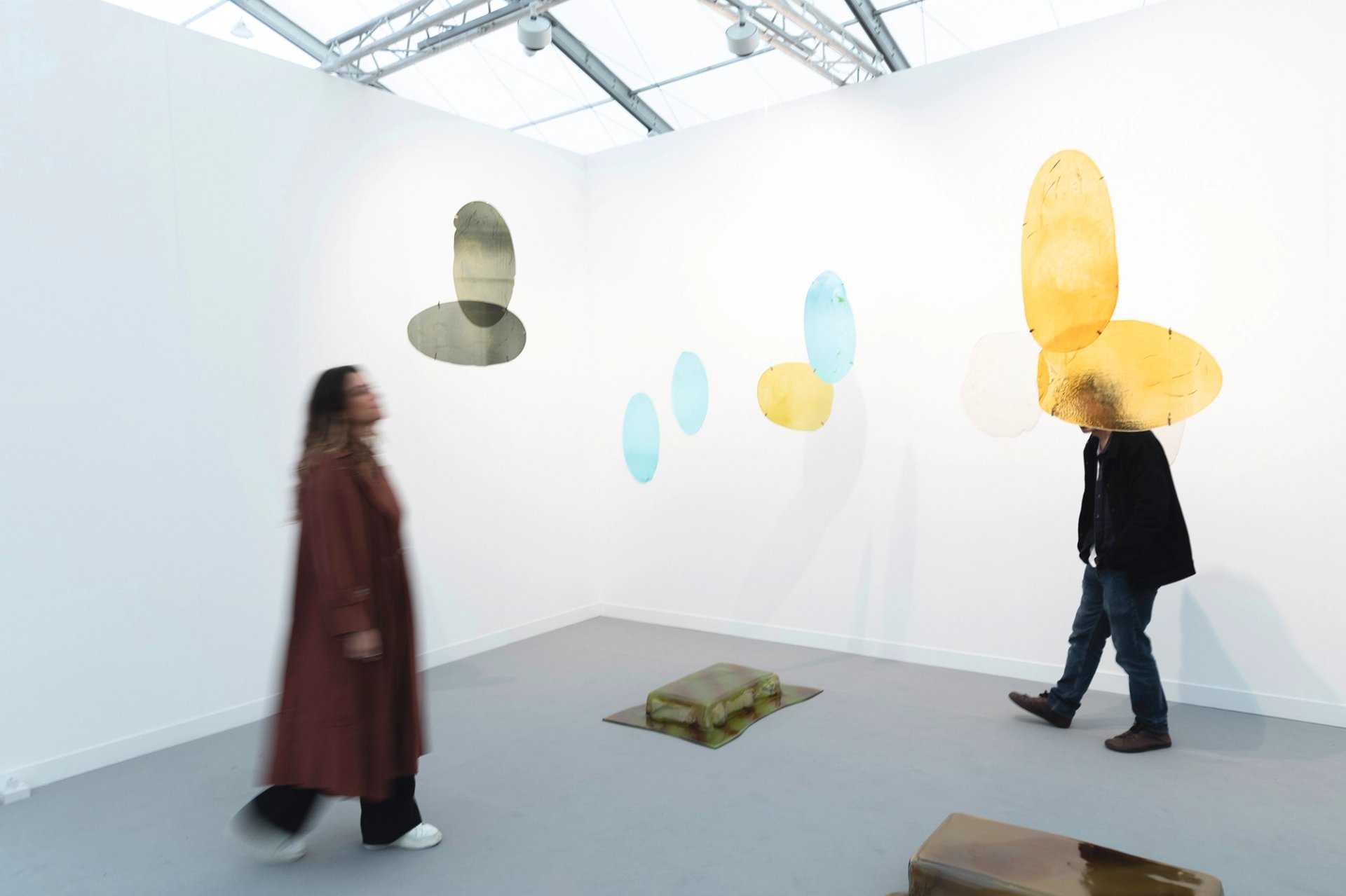 An oasis of quiet reflection, PM8 / Francisco Salas’s stand features two bodies of work by Olšaskaitė in glass. A group of thin, fragile ovals hang over the stand and adorn its walls. They are called Budinti, meaning watcher or overseer. The hanging pieces have faint drawn outlines of female forms, while those on the walls are entirely abstract. On the floor are three works called Benches, which evoke boxes covered in textiles, but also seem to be caught between solid and liquid states, as if melting. The glass is repurposed from old factories from the Soviet era, lending further poeticism to Olšaskaitė’s lyrical endeavour.