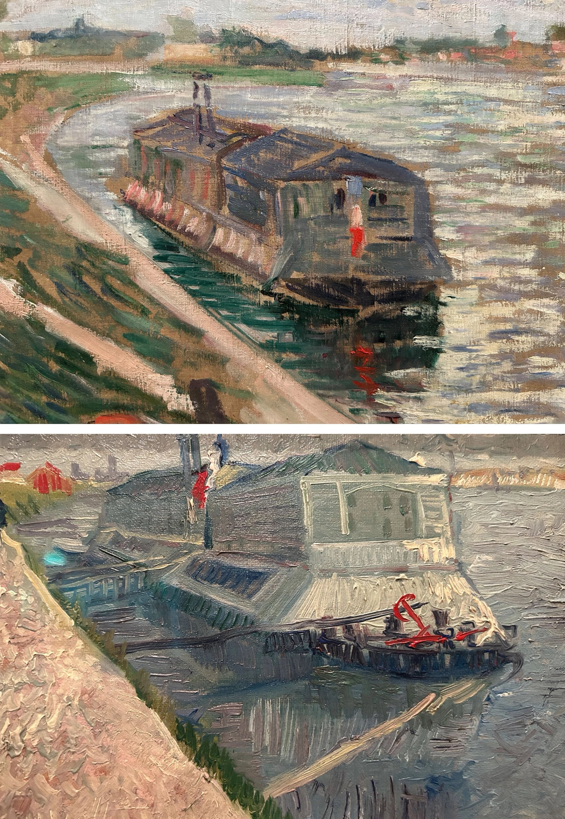 Paul Signac’s Quai de Saint-Ouen (1885) (detail) and Van Gogh’s The Laundry Boat on the Seine at Asnières (May-July 1887)
