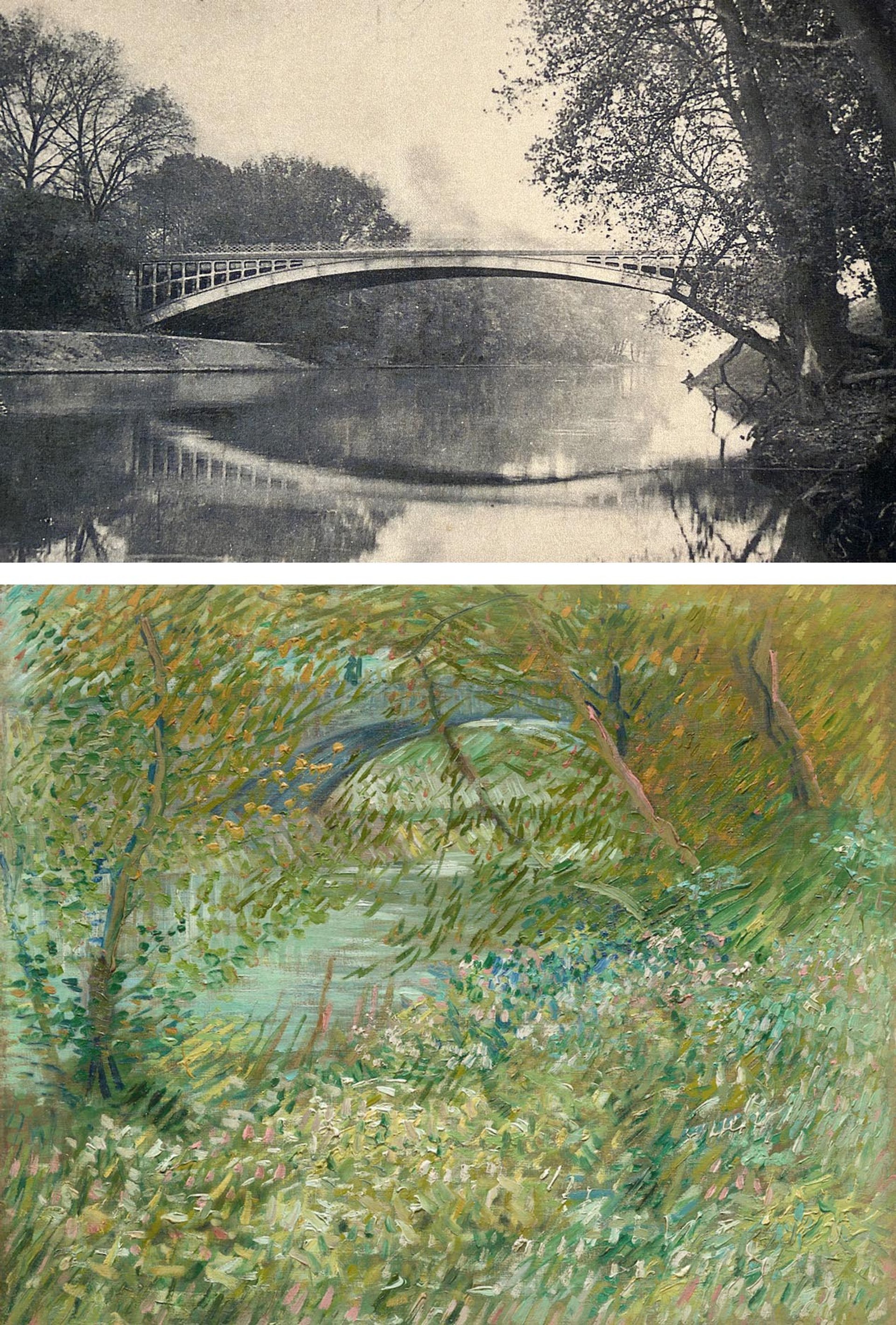 Two views of the same motif: a postcard (around 1905) of the middle arch of the Pont de Clichy and Van Gogh’s River Bank at Springtime (May-July 1887)