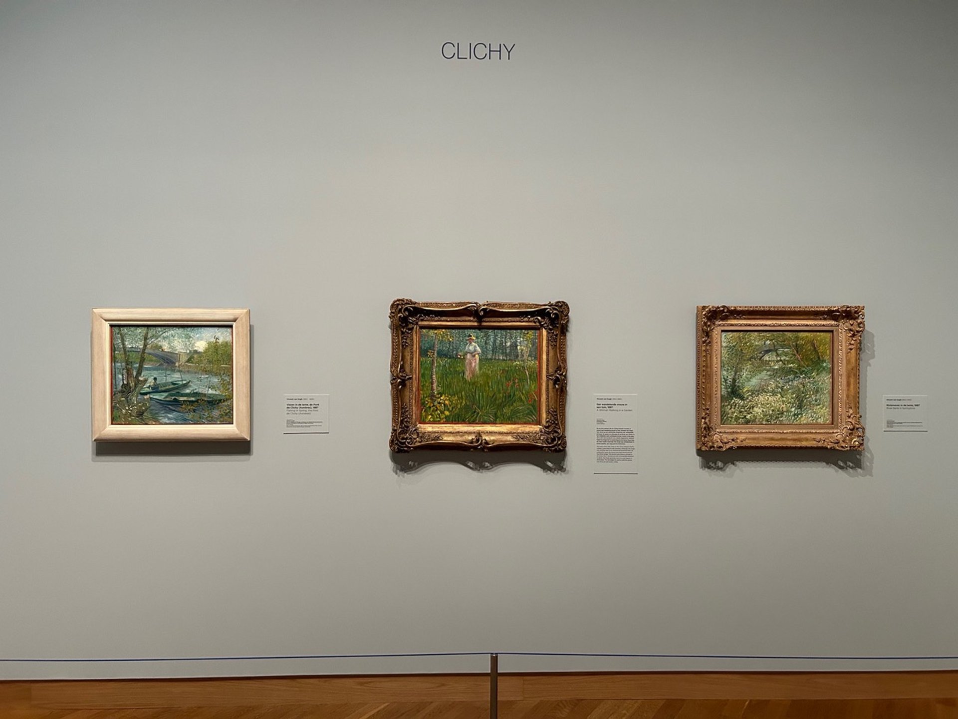 Seeing the reconstructed triptychs hanging in the exhibition makes one realise quite what a difference frames make. In the Clichy triptych, the Art Institute of Chicago’s simple frame represents a strong contrast with the ornate gilded surround on the loan from a private collection. Van Gogh himself favoured plain wooden frames.