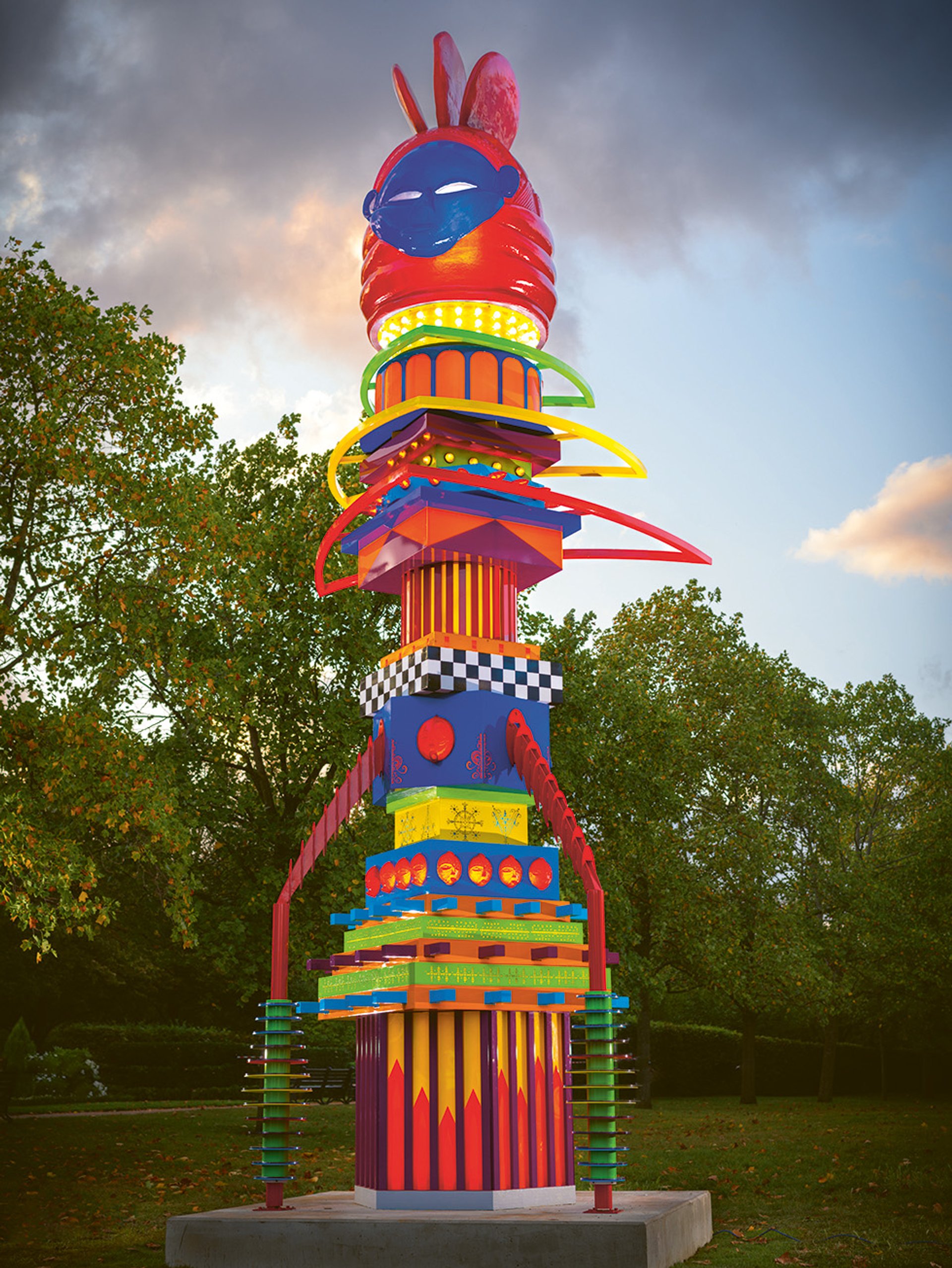 Zak Ové is not an artist known for holding back. His two giant carnivalesque moko jumbie stilt-walker sculptures at present preside over the British Museum’s Africa Galleries, with another version in the permanent collection of the Art Gallery of Ontario. Over the past few years his crowd of 80 identically cast graphite figures—based on a wooden sculpture from Kenya and each standing at 2m high—have been lined up before Somerset House in London, Los Angeles County Museum of Art, San Francisco’s City Hall and the Yorkshire Sculpture Park. Now, the British-Trinidadian artist is showing his largest work yet, The Mothership Connection (2021), a massive, multi-coloured structure nearly 9m high, and a serious show-stopper in the Frieze Sculpture presentation in Regent’s Park.