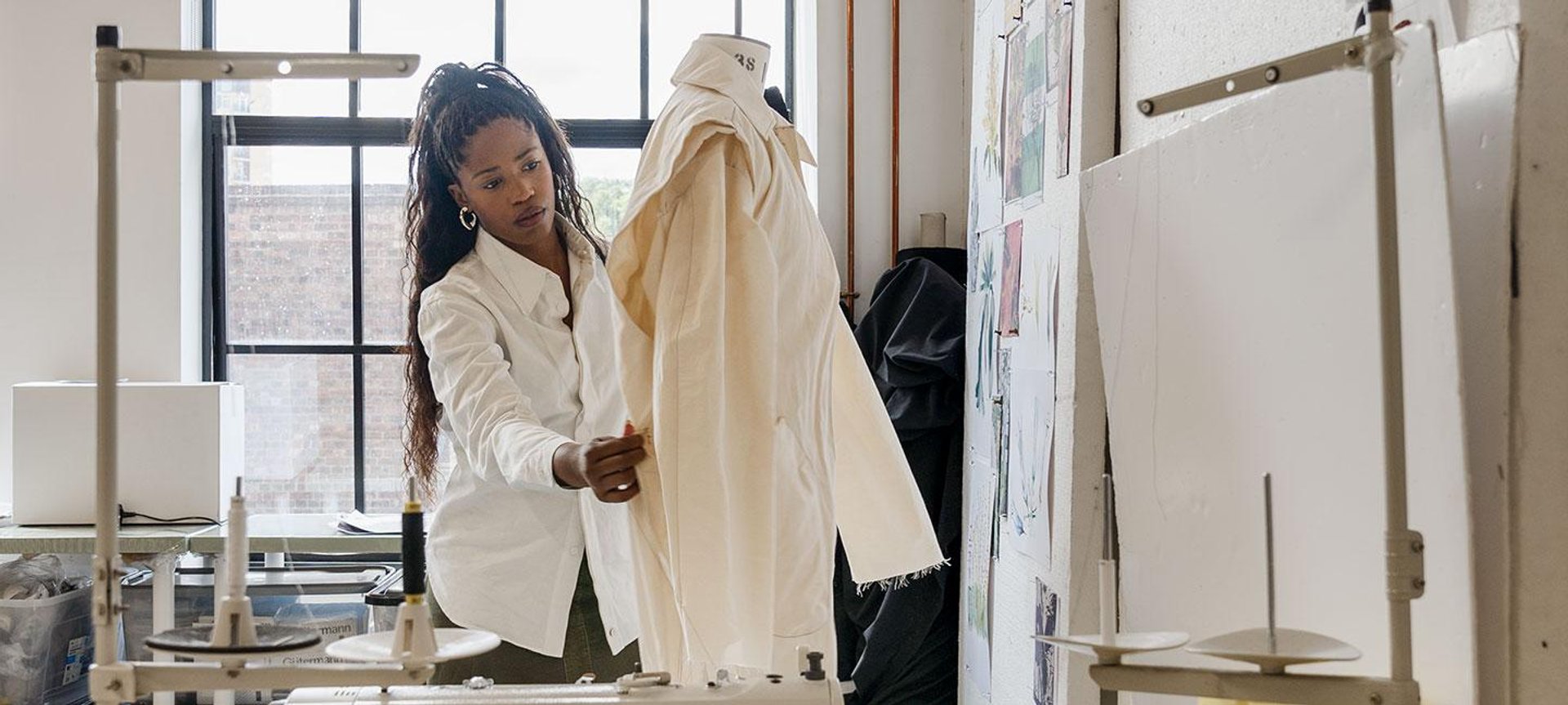 Bianca Saunders working on a sample of her commission at her Hackney studio