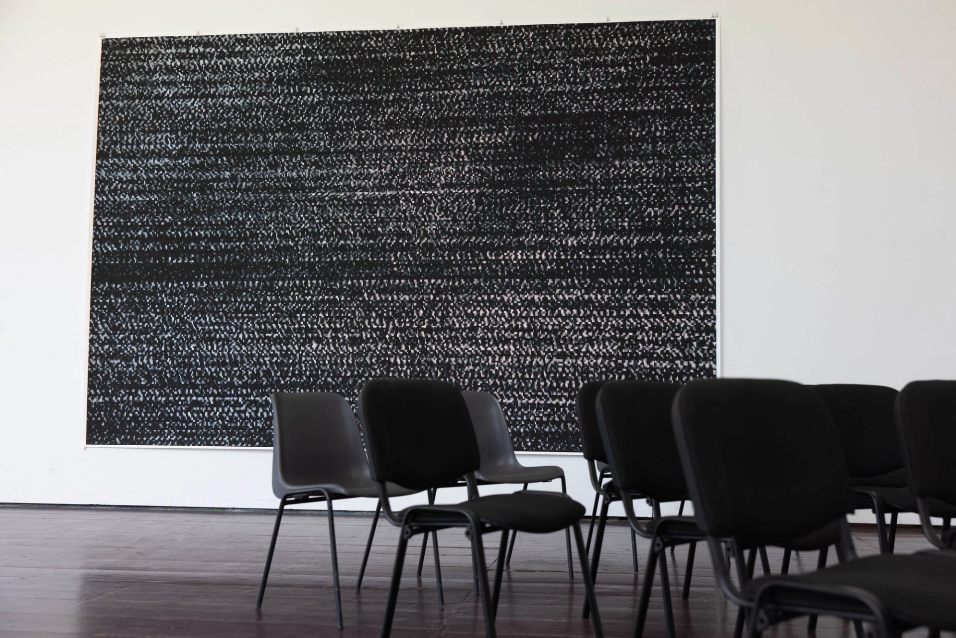 Prouvost's five-part video installation is shown on TV monitors that are covered with cloth or turned towards the floor or wall so that they’re nearly impossible to view, suggesting something unwatchable or intentionally obscured. Tillmans presents a large 2014 inkjet print depicting what looks like television static, while also giving space to photojournalist Friedrich Bungert's photos of wounded Ukrainian fighters.