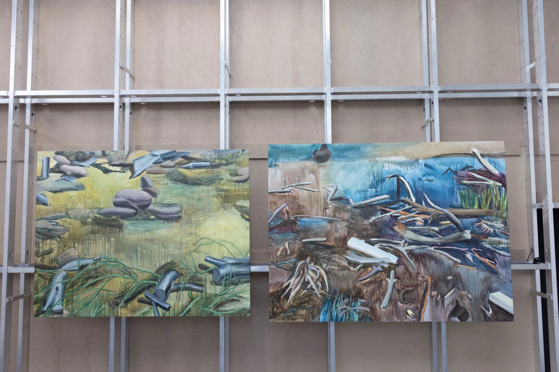 Two acrylic paintings by Aliinyk from 2022, Neglected Part of the Garden and Ukrainian River, feature the landscape of Donbas littered with artillery shells and shrapnel.