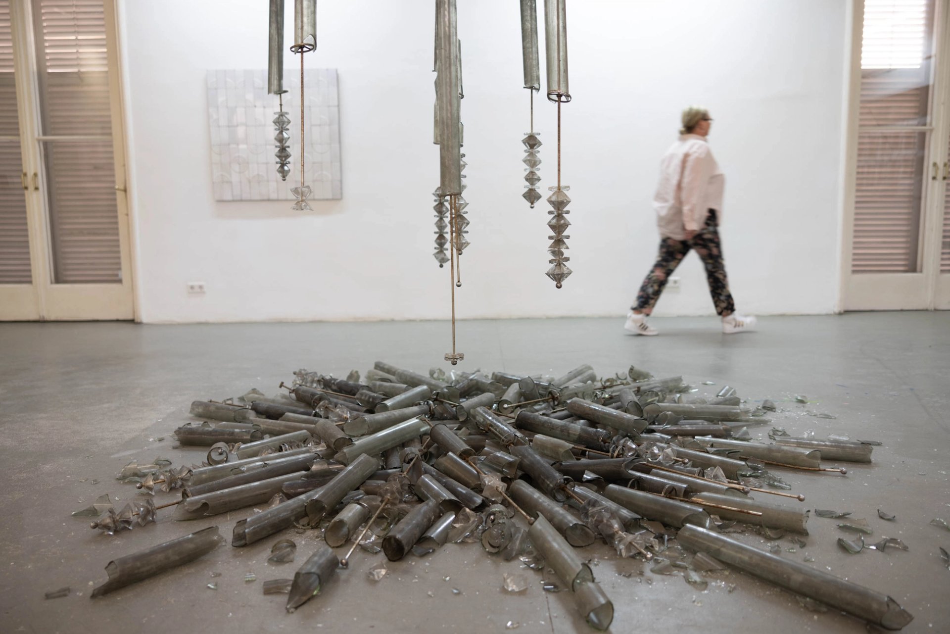 Salute (2022) by the Ukrainian art group De Ne De brings a badly-damaged chandelier from a Kyiv hotel into the exhibition space