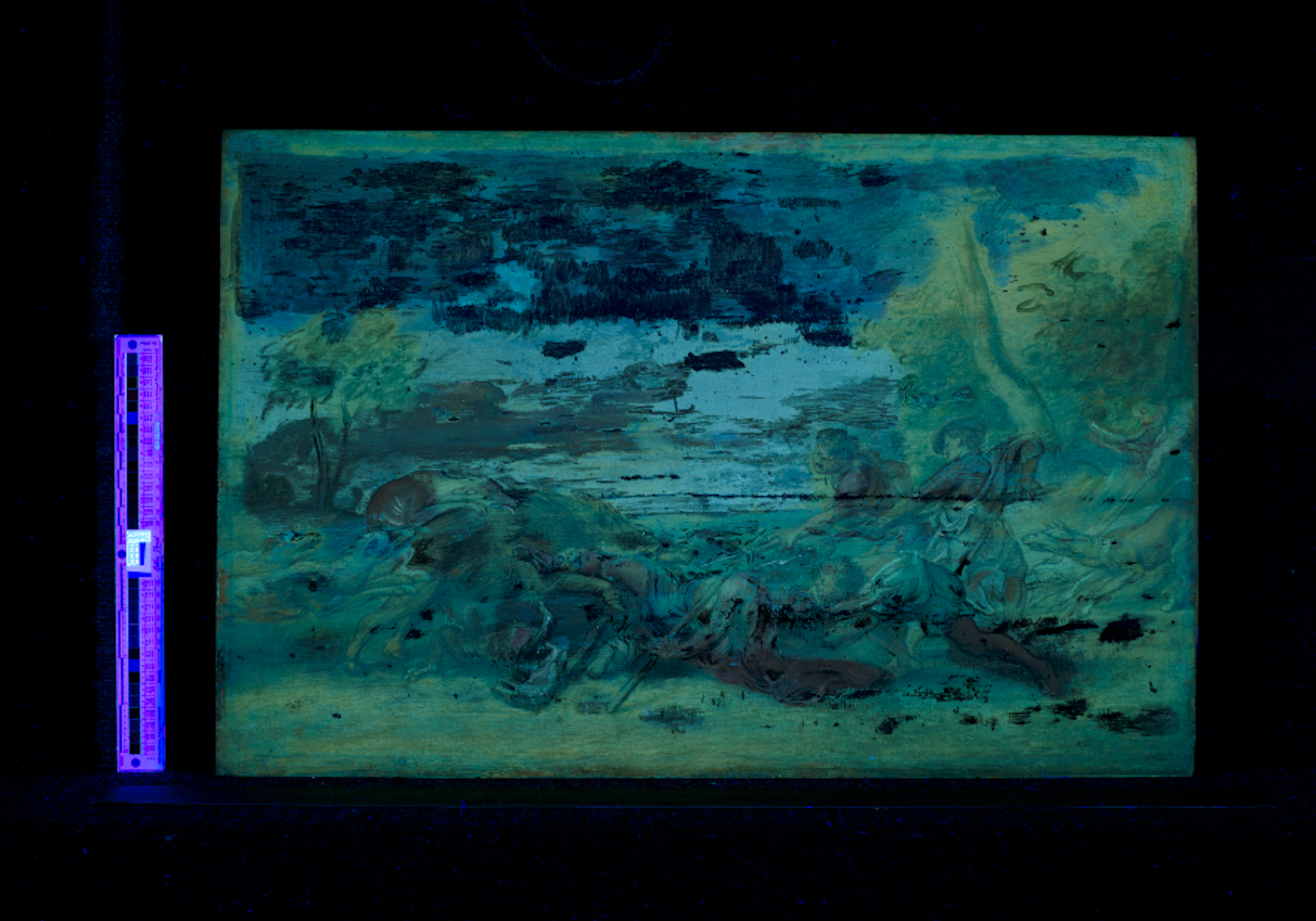 Peter Paul Rubens's Death of Adonis (1639) under UV light, showing all of the previous restoration work Courtesy the Princeton University Art Museum