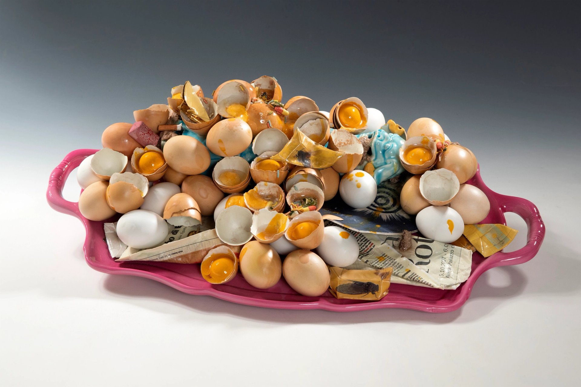 At first glance, Sperone Westwater’s stand looks like someone forgot to clean up a series of curious messes, such as a platter of broken eggs and apple peels, a stack of discarded cardboard boxes and a paint bucket full of watermelon slices. But a closer look reveals that each tableau is an expertly crafted ceramic sculpture by the Italian duo Giampaolo Bertozzi and Stefano Dal Monte Casoni (the latter of whom died this year).