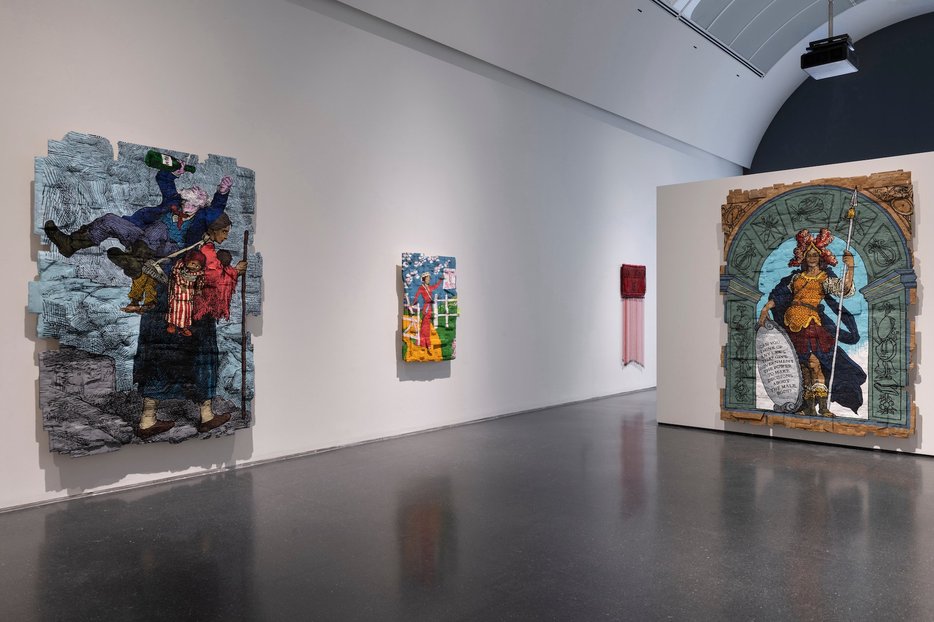 Installation view, Andrea Bowers, MCA Chicago, 2021-22. Wife with Heavy Burden, on left, by Andrea Bowers is a part of the Marilyn and Larry Fields gift Photo: Nathan Keay, © MCA Chicago.