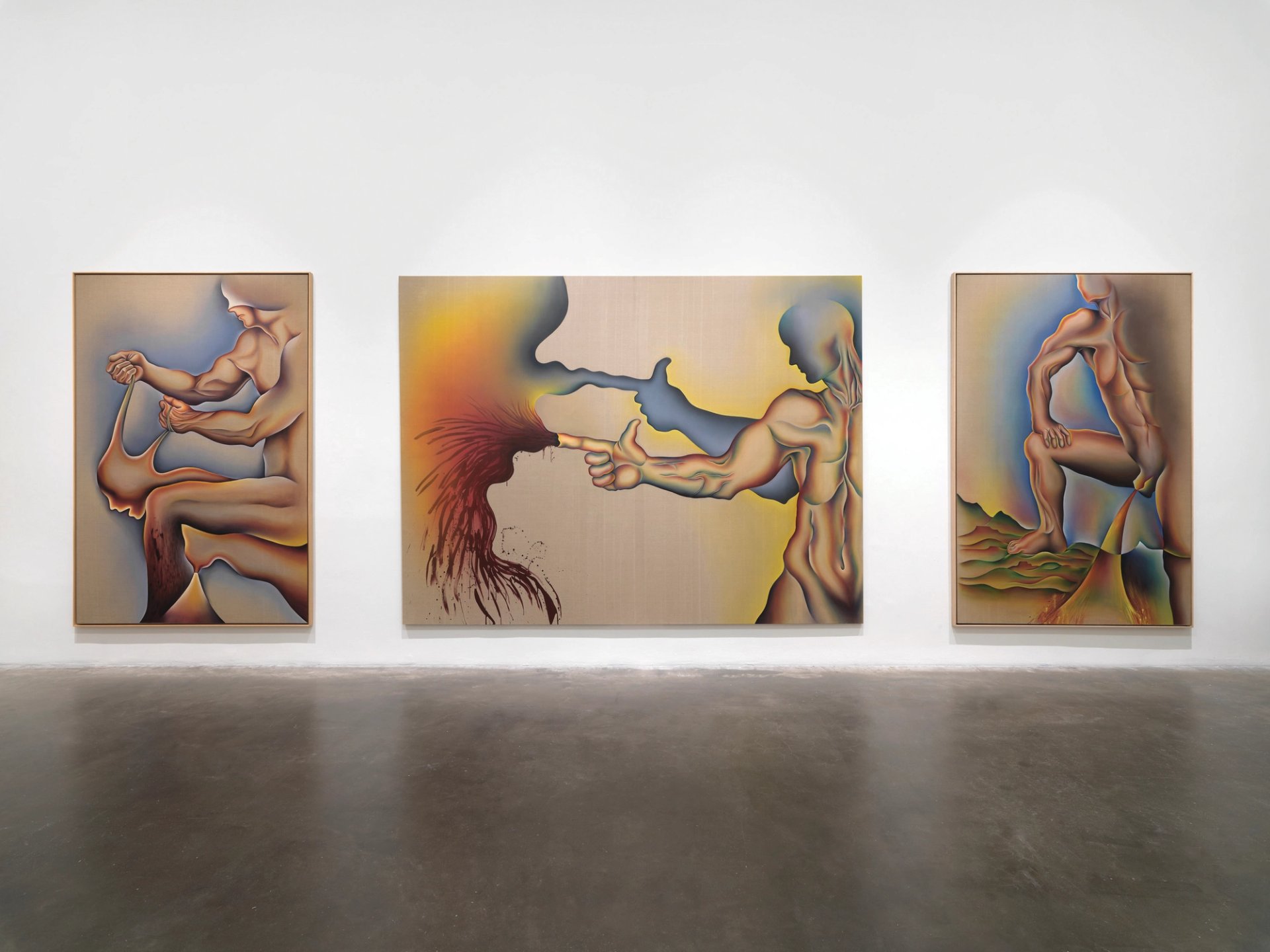 A trio of paintings by Chicago in the recently opened New Museum exhibition (left to right): Crippled by the Need to Control/Blind Individuality (1983), In the Shadow of the Handgun (1983) and Pissing on Nature (1984)