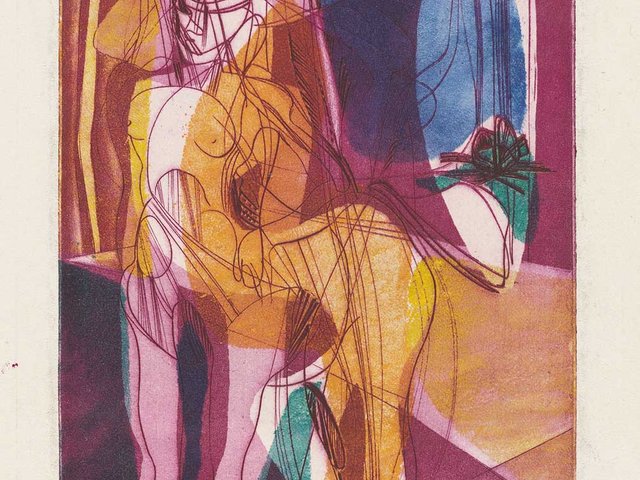In 1936, Wykeham visited the pivotal International Surrealist Exhibition at the New Burlington Galleries in London. Stirred by what she saw, and by the Surrealists’ desire to change the world’s social and political order by altering consciousness, she travelled to Paris where she found creative liberation at Stanley William Hayter’s Atelier 17, the influential print studio at the heart of the Parisian avant-garde. Here, she learned burin engraving and experimented with automatic Surrealist techniques, creating semi-abstract works characterised by undulating and coiling lines. Her pursuit of the radical and unconventional under Hayter led her to rub shoulders with the likes of Jean Arp, Yves Tanguy and Joan Miró. It was a place, writes Levy, where she “was accepted and valued in her own right”.