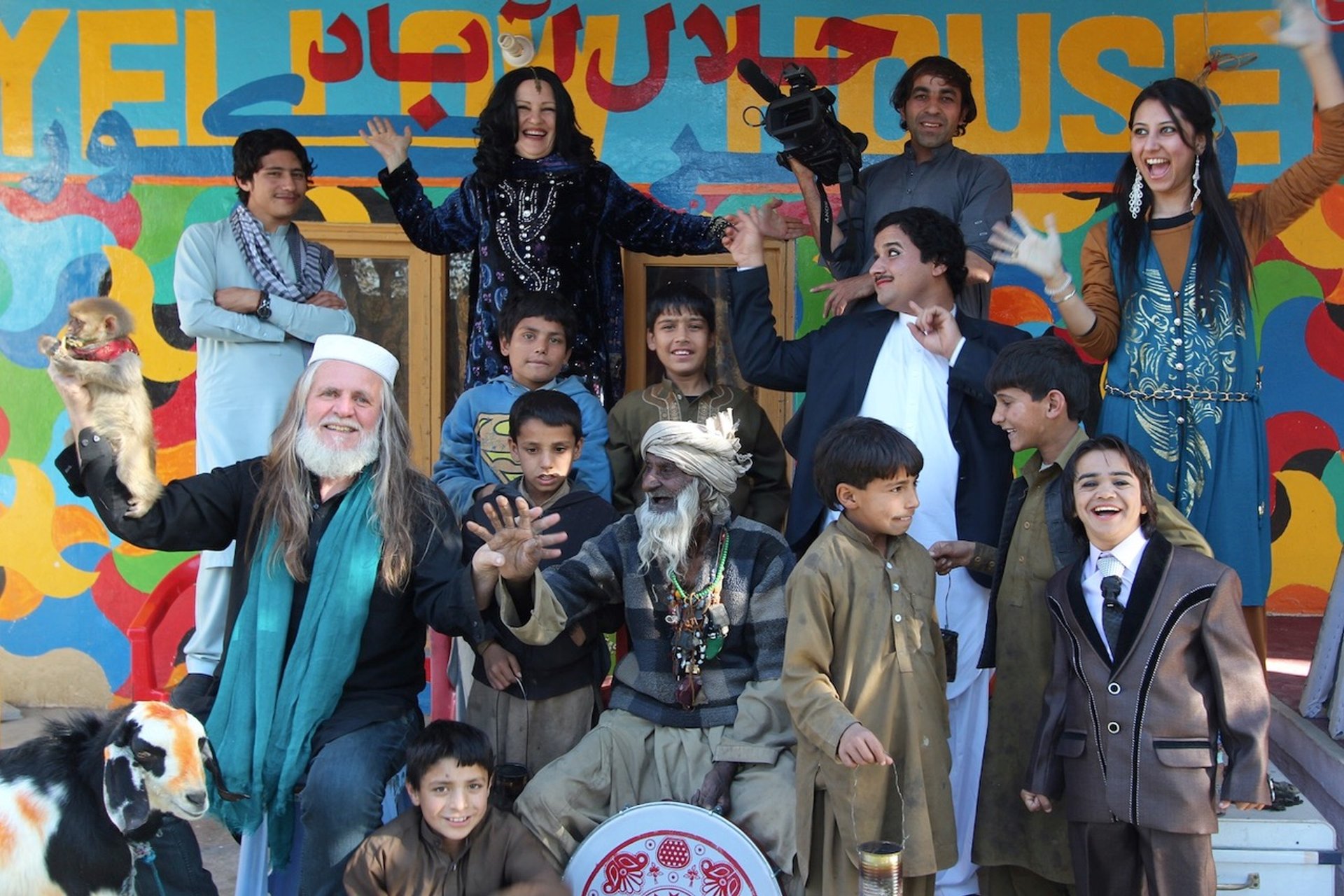 The Yellow House in Jalalabad, with artist George Gittoes holding a monkey