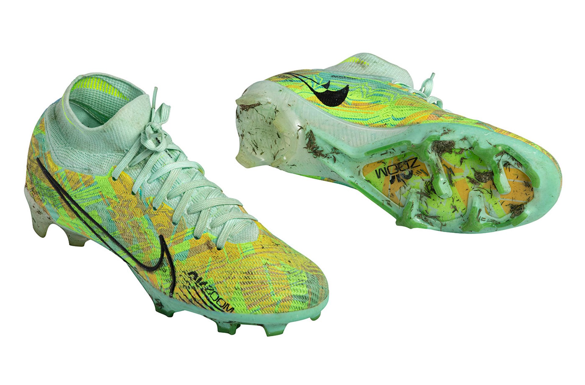 The boots worn by Barbra Banda of Zambia when she scored the 1,000th goal in the 32-year history of the Women's World Cup in a match against Costa Rica. The Fifa Museum's heritage team has conserved the mud and grass on the boots, as the team feels that cleaning items used in live matches would rob them of their authenticity Courtesy Fifa Museum