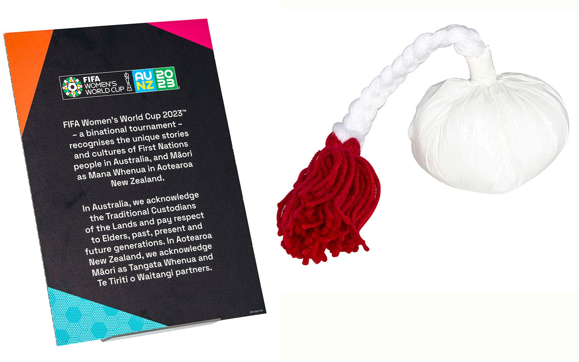 A copy of the Binational Acknowledgement from Fifa Women’s World Cup 2023 (left), presented at the beginning of each game to acknowledge ownership of the land by Indigenous groups in Australia and New Zealand; and a poi, a traditional Maori rope and ball used in the story-telling performance art of the same name Courtesy Fifa Museum