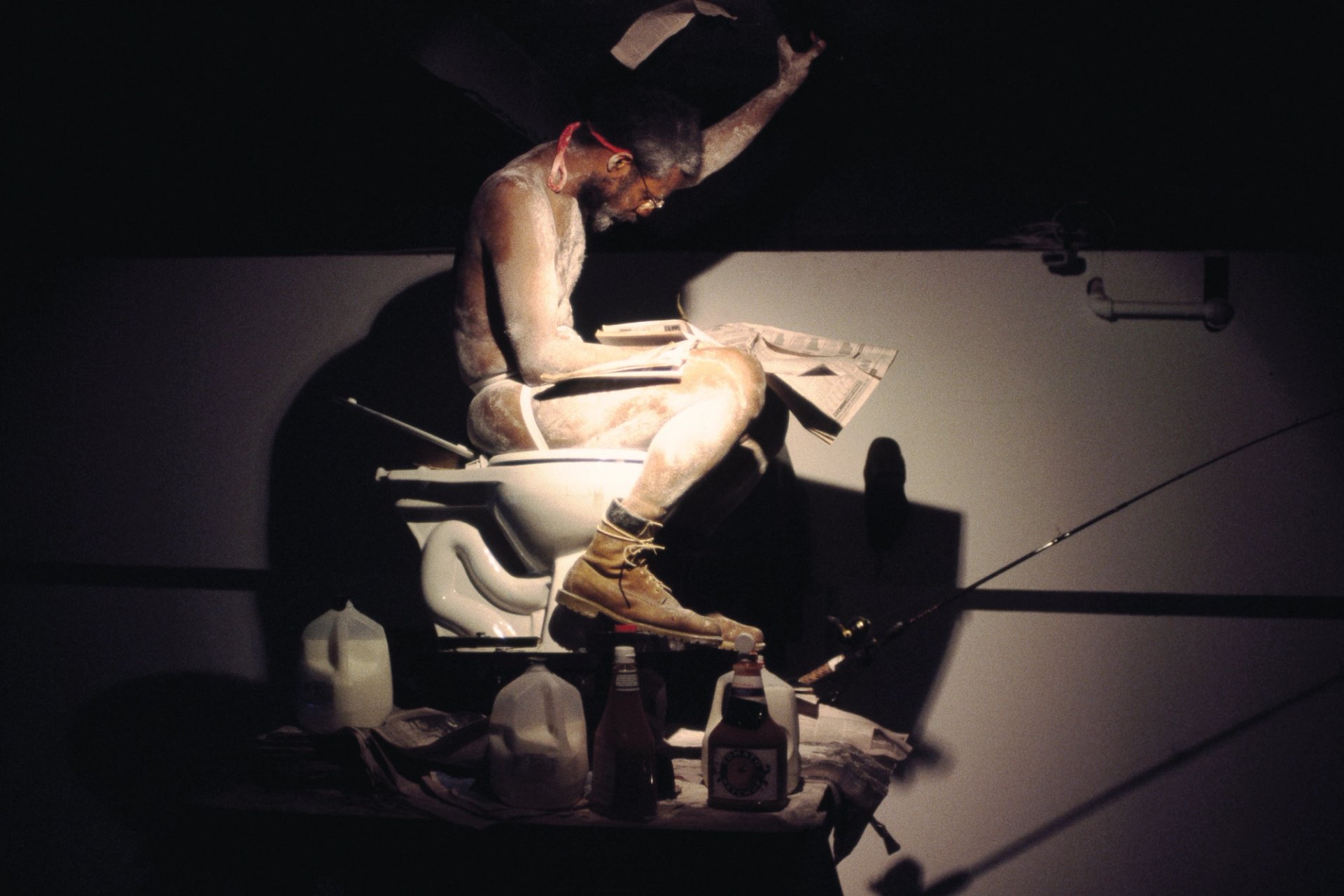 Eating the Wall Street Journal is maybe Pope.L’s most recognisable work, which has been performed in multiple different ways since 1991, when he first sat on an American flag and started eating pages of the Wall Street Journal, washing them down with milk and ketchup. It was a succinct commentary on the US’s glorification of capital and consumption, one made even more poignant when he restaged it at the Museum of Modern Art in 2000 while sitting atop a toilet and covering himself with flour to temporarily colour his skin white. A new version of this work is at the centre of an exhibition at the South London Gallery (SLG). For this iteration, Pope.L has removed the live performance element and, instead, three 4m-high wooden towers, topped with toilets and in various stages of collapse, will dominate the gallery’s main space. Around them, the Wall Street Journal issues will be stacked and milk jugs scattered; a flour-like substance will accumulate over the whole of the installation throughout the run of the show. The exhibition, which also includes previous film works like Small Cup (2008) and his Skin Set drawings from 2013, will be the artist’s first institutional solo show in the UK.