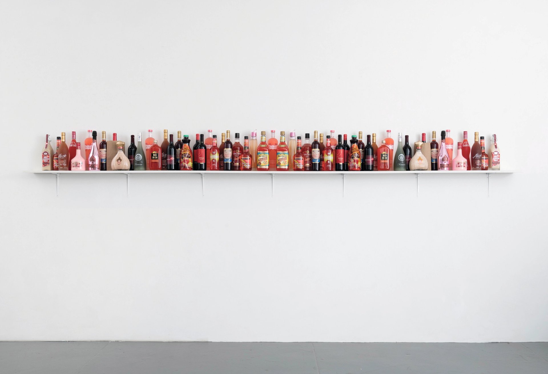 I started making shelf works in the 1990s. The content for most of those works was organic materials such as onions or potatoes, or more processed goods such as cheap drinking alcohol and children’s things. The bottles I am using in the SLG show are UK products, either Buckfast or Cactus Jack drinking alcohol. Both of these products (Buckfast the older, Cactus Jack the contemporary) are marketed to young people (or the child in the adult) as an inexpensive means for altering one’s consciousness.
