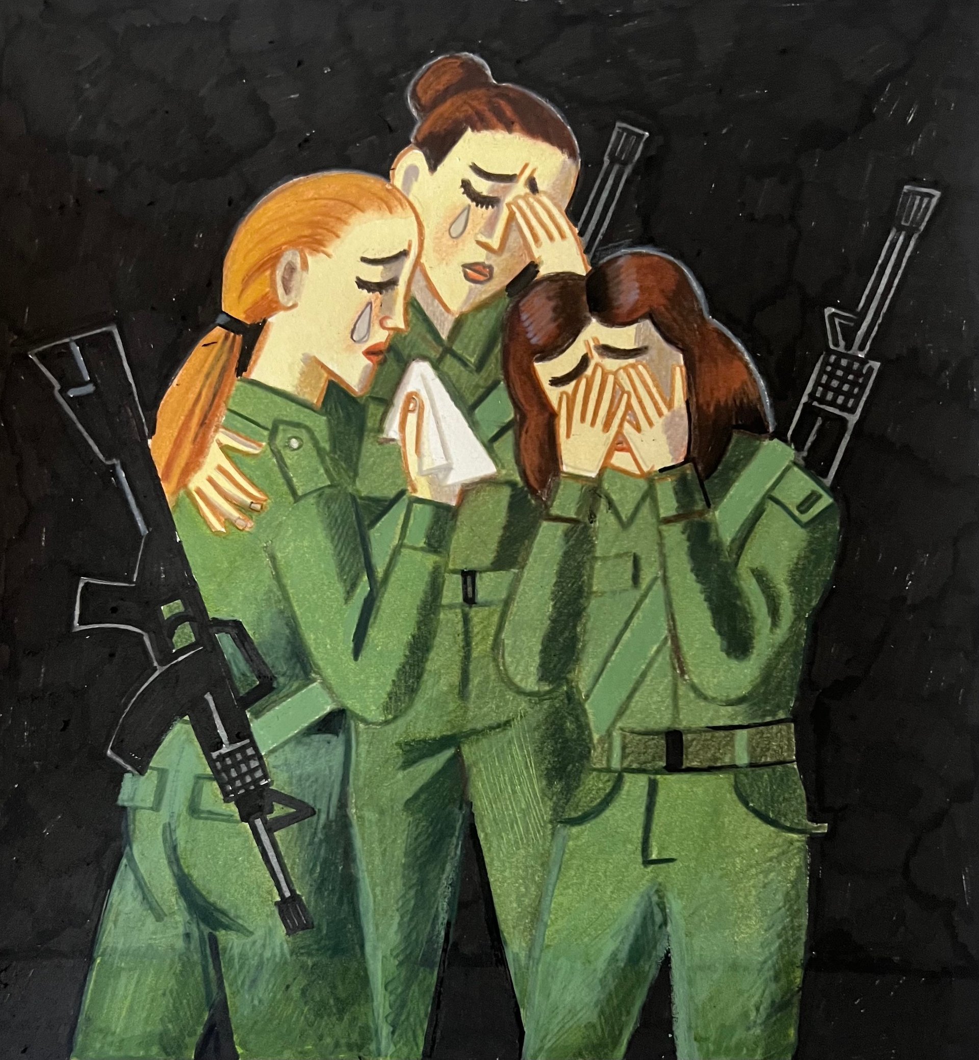 Yes, I actually had an earlier sketch for this image, before everything that happened. It was a critical image, because it’s a sensitive, female scene of women crying, but they’re soldiers. It’s the contradiction of being Israeli. This unimaginable thing just happened [to Israelis]. But also, Israel is occupying Palestine. As a leftist I used to criticise the Israeli government and I still believe in a two-state solution. It has two faces, this image. The gentle one, of girls that have feelings. The other one: they are soldiers and they are part of a system of oppression.