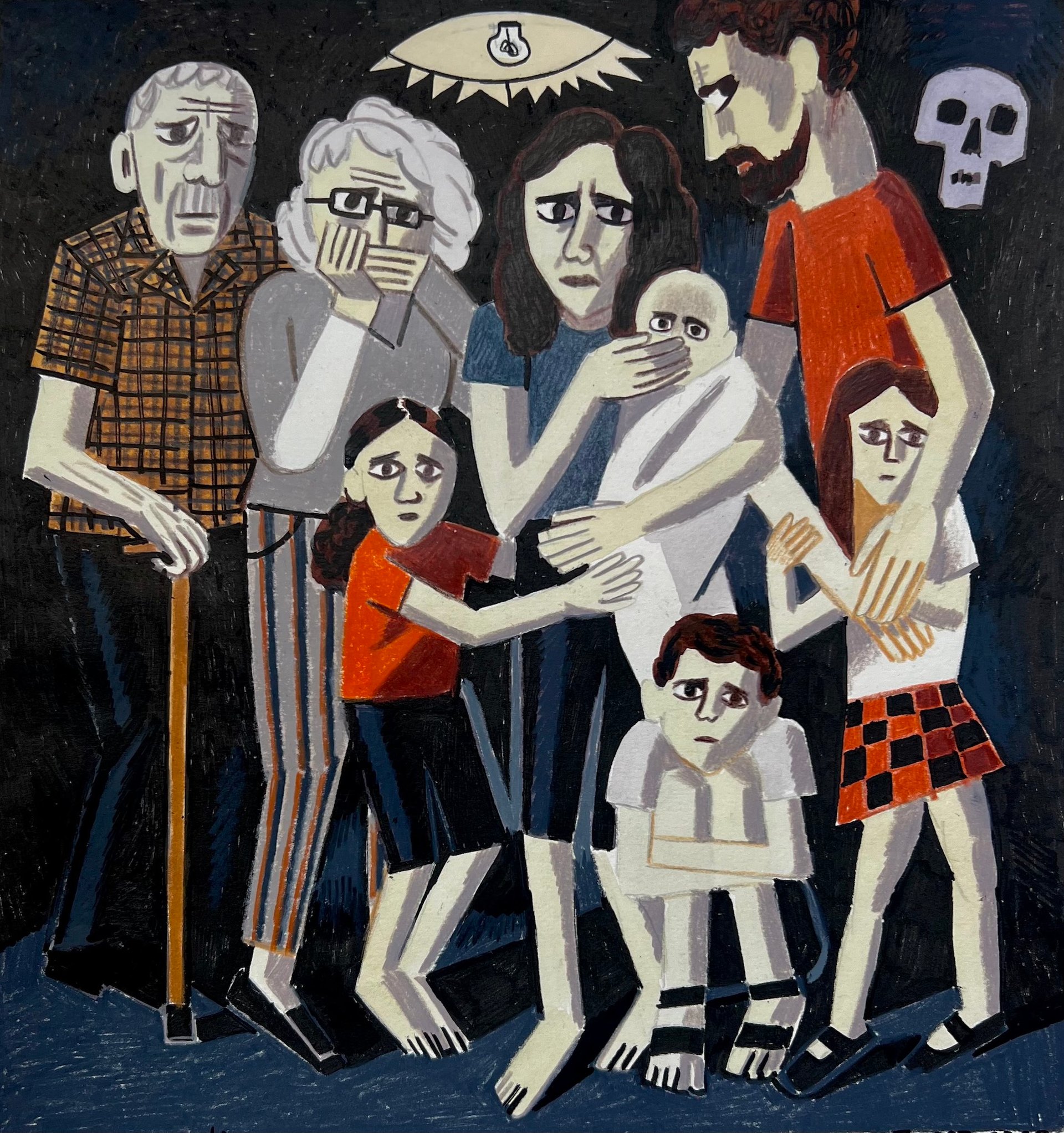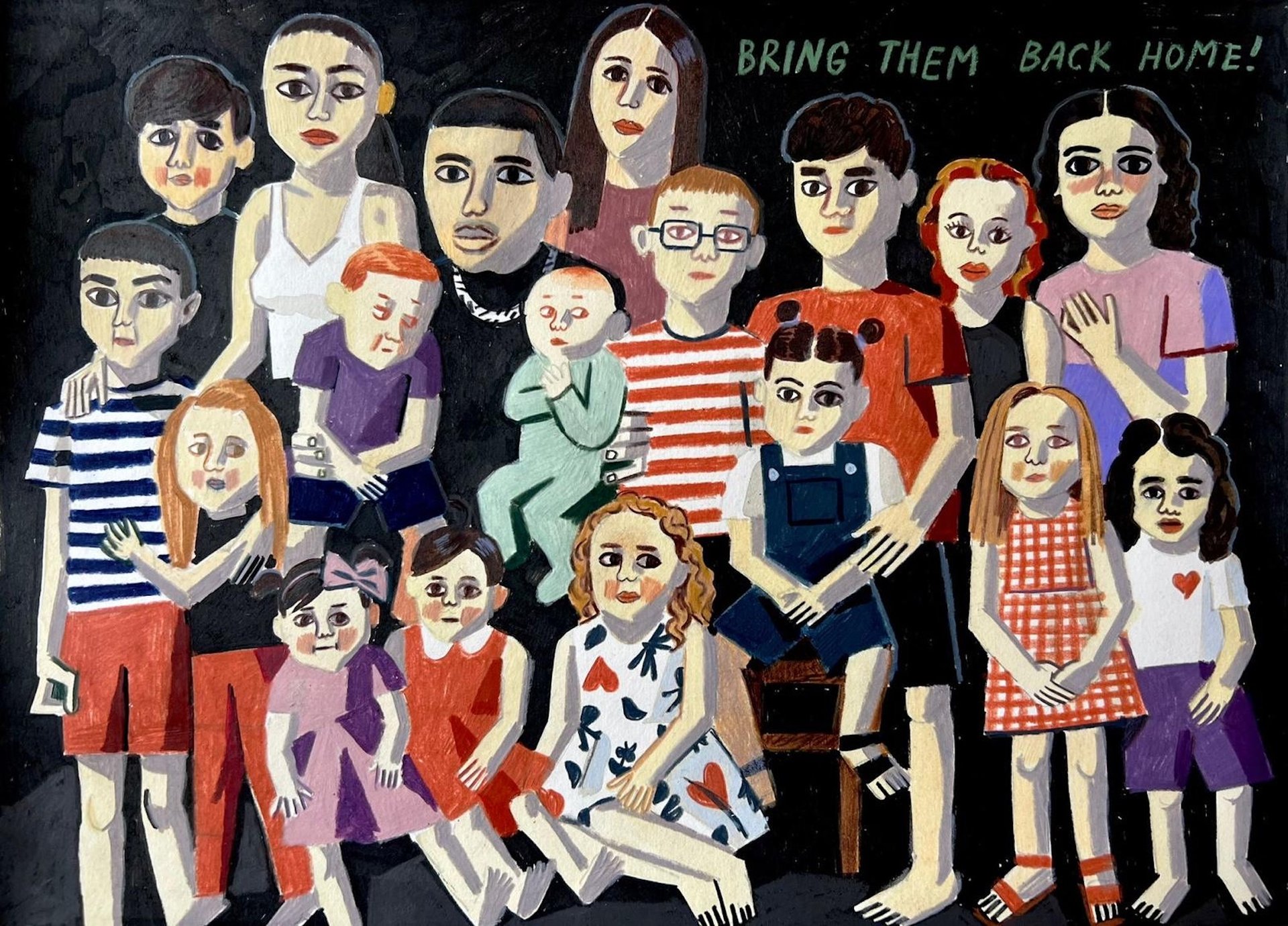 I’ve seen all the images, but I didn’t work directly from particular images. I tried to avoid particular people because it’s important to me to show that it can be anyone, it’s not a particular person. The only image where I used real people was the image of kidnapped kids. When I made it, it was only known about 18 of them. Now there are over 30. Many people in Israel have asked if they can use this image for publishing or as a poster. One company in Tel Aviv has printed it really huge and it’s being used as a poster to [advocate for] bring them back.
