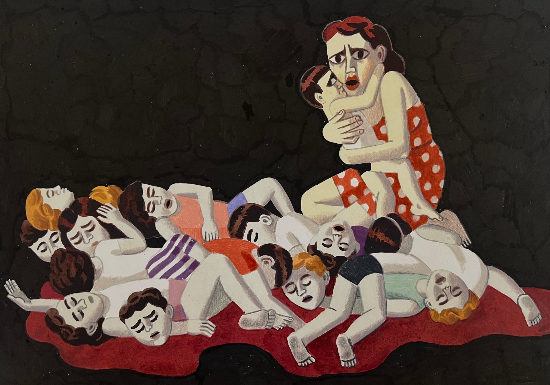 In my city, Tel Aviv, everyone sings on the streets and throws candy from the windows. It’s a celebration of the day when the Torah was given to the Jews. And of course, everything was cancelled because of the attacks. This painting shows Simchat Torah in the kibbutz—it’s a little bit inside [debates going on] in Israel because women are not part of this celebration in Orthodox Jewish communities, and of course they don’t hold the Torah scroll. But in the kibbutz it’s different. In the kibbutz it’s celebrated in a non-religious way. They celebrate it as tradition and not religion. In the painting, there is a girl holding the scroll. They are carrying guns because people say it was unimaginable for this Holocaust scenario to happen in the state of Israel. It was the whole idea of Israel, to not be in these kinds of situations again. So what I painted was an imagined scene and a symbolic one.